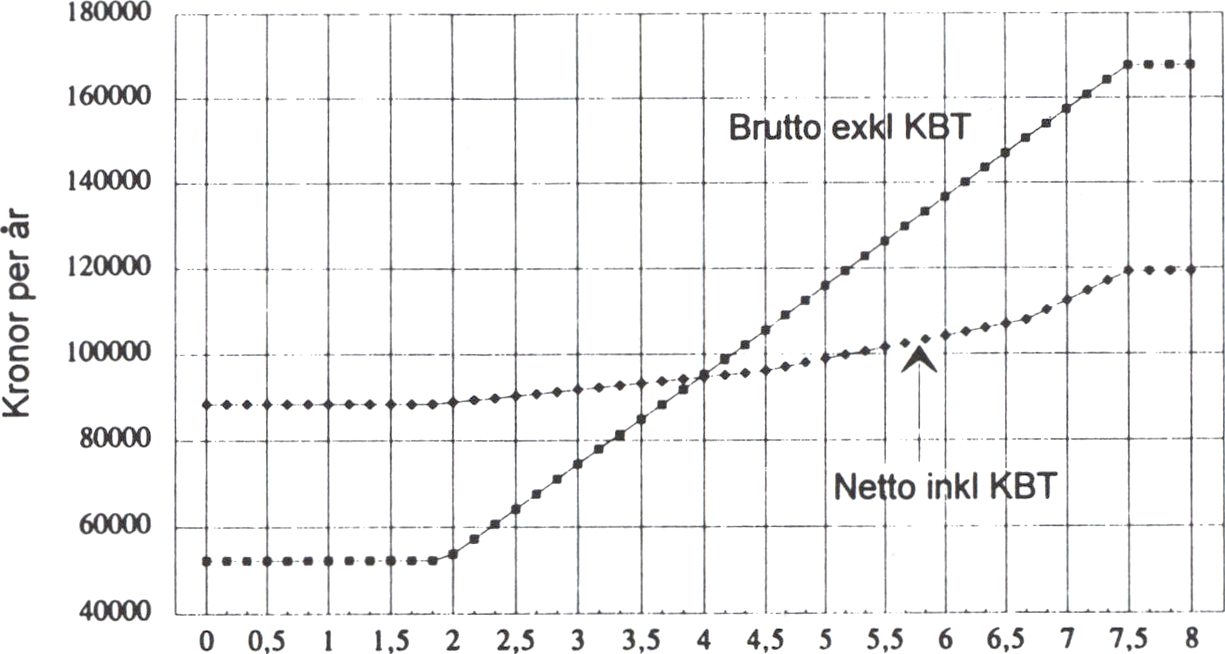 b) Antagen tillväxt i lönesumman 3 % per år 1995 - 2000, 1,5 % per är därefter