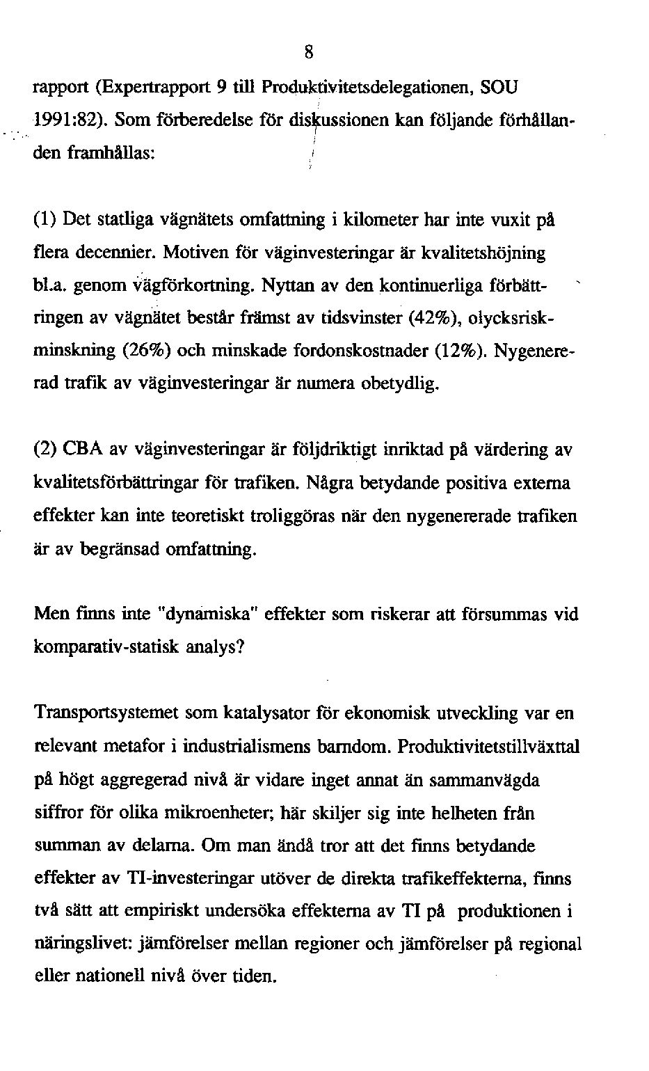 (2) CBA av väginvesteringarär följdriktigt inriktad på värdering av kvalitetsförbättringarför trafiken. Någrabetydandepositiva externa effekterkan inte teoretiskttroliggöras när dennygenereradetrafIken är av begränsadomfattning.