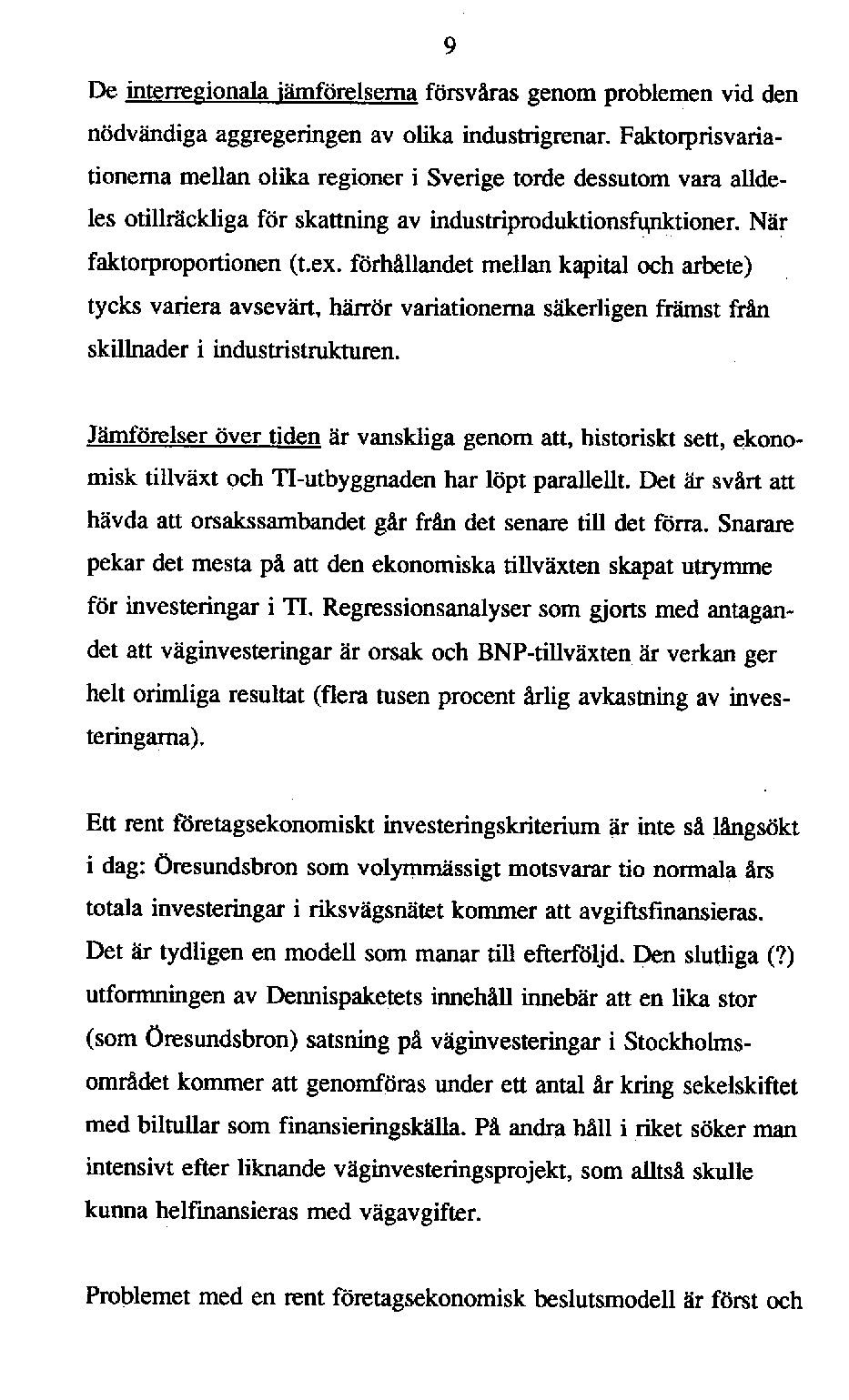Ett rent företagsekonomisktinvesteringskriteriumär inte så långsökt i dag: Öresundsbronsomvolymmässigtmotsvarartio normalaårs totala investeringari riksvägsnätetkommer att avgiftsfinansieras. Det är tydligen en modell sommanartill efterföljd. Den slutliga (?) utformningenav Dennispaketetsinnehåll innebäratt enlika stor (somÖresundsbron)satsningpå väginvesteringar Stockholmsområdetkommer att genomförasunderett antalår kring sekelskiftet med biltullar somfinansieringskälla.På andrahåll i riket sökerman intensivt efter liknande väginvesteringsprojekt,somalltså skulle kunnahelfmansierasmed vägavgifter.