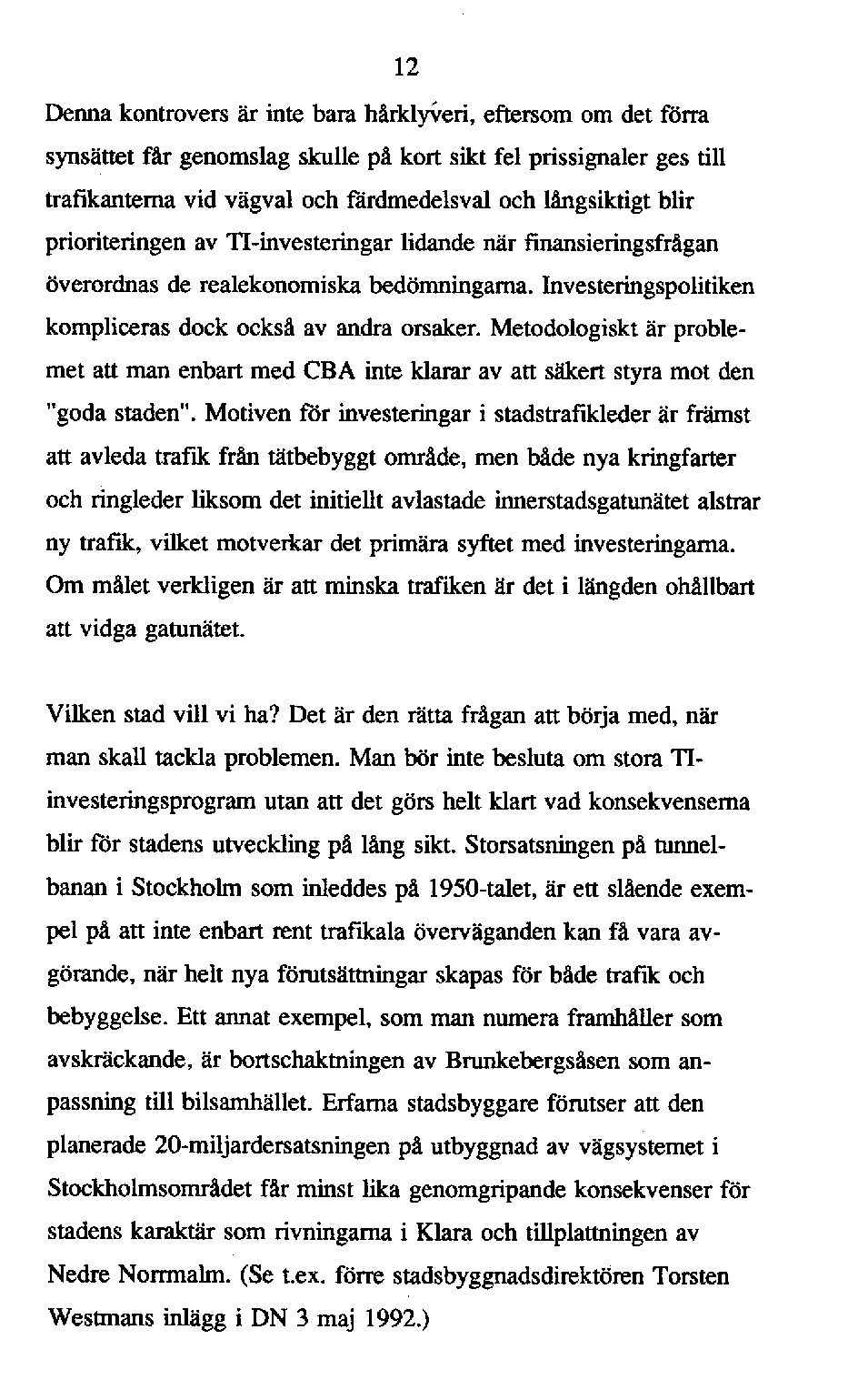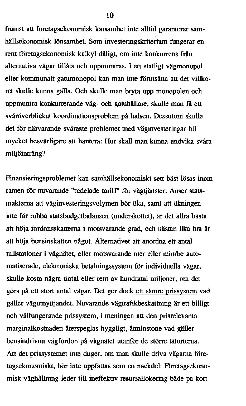 främst att företagsekonomisklönsamhetinte alltid garanterarsamhällsekonomisklönsamhet.Som investeringskriteriumfungeraren rent företagsekonomiskkalkyl dåligt, om inte konkurrensfrån alternativavägar tillåts ochuppmuntras.I ett statligt vägmonopol eller kommunaltgatumonopolkan man inte förutsättaatt detvillkoret skulle kunna gälla. Och skulle man bryta upp monopolenoch uppmuntrakonkurrerandeväg- och gatuhållare,skulle man få ett svåröverblickatkoordinationsproblempå halsen.Dessutomskulle det för närvarandesvårasteproblemetmed väginvesteringarbli mycket besvärligareatt hantera:Hur skall man kunnaundvika svåra miljöintrång?