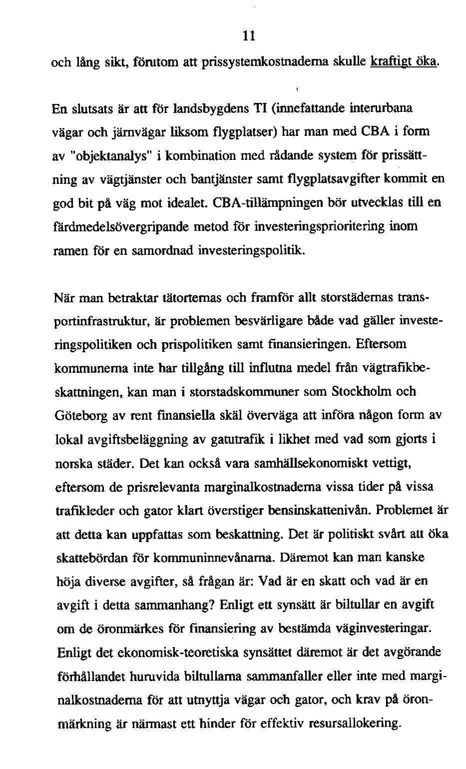 Finansieringsproblemetkan samhällsekonomisktsettbästlösas inom ramenför nuvarande"tudeladetariff' för vägtjänster.Anserstatsmakternaatt väginvesteringsvolymenbör öka, samtatt ökningen inte får rubba statsbudgetbalansen(underskottet),är det allra bästa att höja fordonsskatternai motsvarandegrad, och nästanlika bra är att höja bensinskattennågot. Alternativet att anordnaett antal tullstationeri vägnätet,eller motsvarandemer eller mindre automatiserade,elektroniskabetalningssystemför individuella vägar, skulle kosta någratiotal eller rent av hundratalmiljoner, om det görs på ett stort antalvägar. Det ger dock ett sämreUrissystemvad gäller vägutnyttjandet.NuvarandevägtrafIkbeskattningär ett billigt ochvälfungerandeprissystem,i meningenatt denprisrelevanta marginalkostnadenåterspeglashyggligt, åtminstonevad gäller bensindrivnavägfordonpå vägnätetutanför de störretätorterna. Att det prissystemetinte duger,om man skulle driva vägarnaföre-