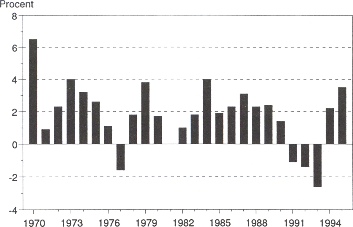 leder till att BNP växer väsentligt långsammare fram till 1998. Arbetslös-