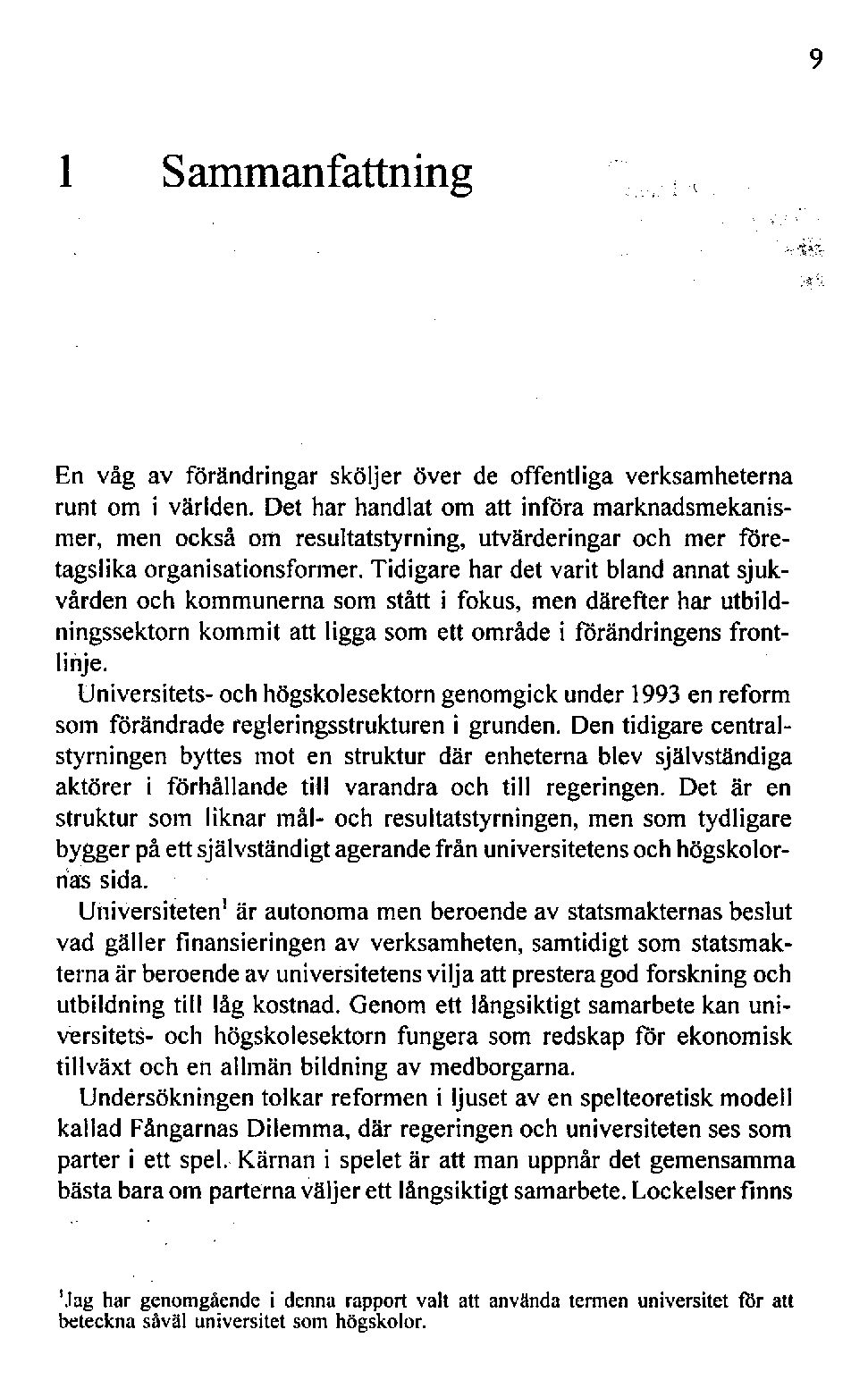 Undersökningentolkar reformen i ljuset aven spelteoretisk modell kallad FångarnasDilemma, där regeringenoch universitetenses som parter i ett spel. Kärnan i spelet är att man uppnår det gemensamma bästabara om parternaväljer ett långsiktigt samarbete.Lockelserfinns