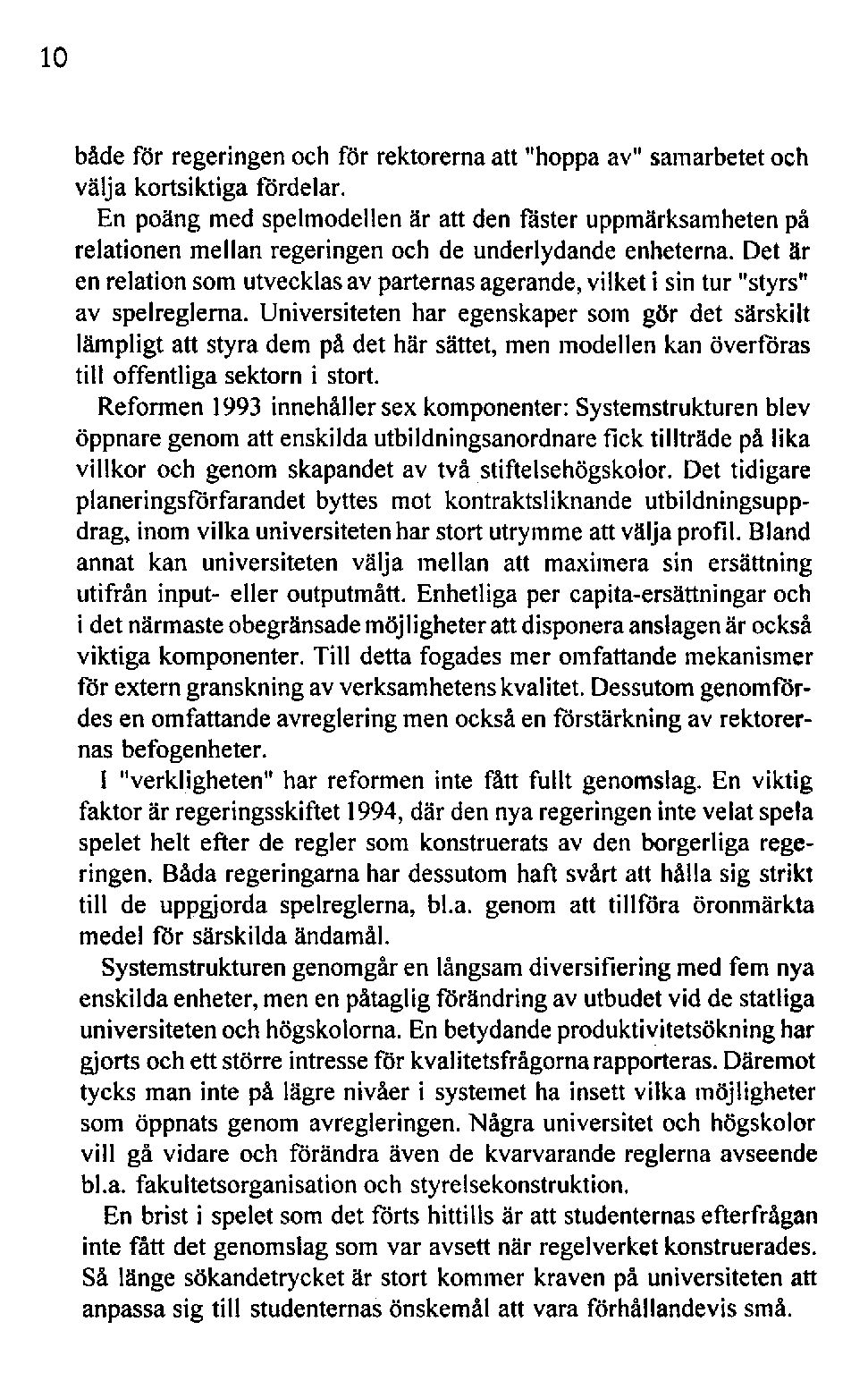 Reformen 1993 innehåller sexkomponenter:Systemstrukturenblev öppnare genom att enskilda utbildningsanordnarefick tillträde på lika villkor och genom skapandetav två stiftelsehögskolor. Det tidigare planeringsförfarandet byttes mot kontraktsliknande utbildningsuppdrag, inom vilka universitetenhar stort utrymme attvälja profil. Bland annat kan universiteten välja mellan att maximera sin ersättning utifrån input- eller outputmått. Enhetliga per