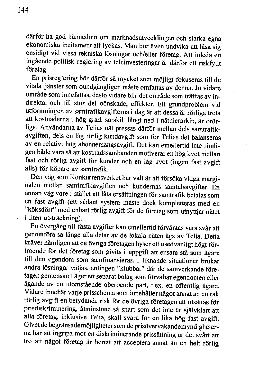En prisreglering bör därför så mycket som möjligt fokuserastill de vitala tjänster som oundgängligenmåsteomfattas av denna.Ju vidare område som innefattas,destovidare blir detområde somträffas av indirekta, och till stor del oönskade, effekter. Ett grundproblem vid utformningen av samtrafikavgifterna i dag är att dessaär rörliga trots att kostnadernai hög grad, särskilt långt ned i näthierarkin, är orörliga. Användarna av Telias nät pressasdärför mellan dels samtrafikavgiften, dels en låg rörlig kundavgift som för Telias del balanseras aven relativt hög abonnemangsavgift.Det kan emellertid inte rimligenbådevara så att kostnadssambandenmotiverar en hög kvot mellan fast och rörlig avgift för kunder och en låg kvot (ingen fast avgift alls) för köpare av samtrafik.