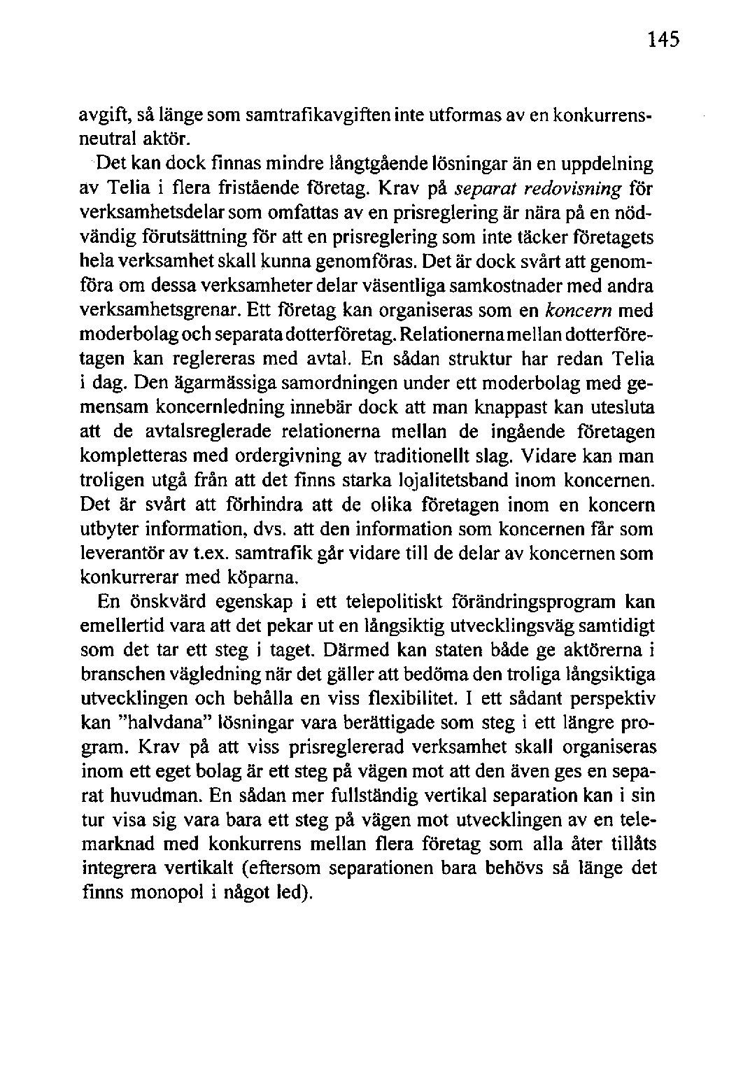 Det kan dock finnas mindre långtgåendelösningar än enuppdelning av Telia i flera fristående företag. Krav på separat redovisning för verksamhetsdelarsomomfattas aven prisreglering är nära på ennödvändig förutsättning för att enprisreglering sominte täcker företagets hela verksamhetskall kunnagenomföras.Det är dock svårt attgenomföra om dessaverksamheterdelarväsentliga samkostnadermed andra verksamhetsgrenar.Ett företag kan organiserassom en koncern med moderbolagochseparatadotterföretag.Relationernamellandotterföretagen kan reglereras med avtal. En sådan struktur har redan Telia i dag. Den ägarmässigasamordningenunder ett moderbolagmed gemensamkoncernledning innebär dock att man knappastkan utesluta att de avtalsreglerade relationerna mellan de ingående företagen kompletterasmed ordergivning av traditionellt slag. Vidare kan man troligen utgå från att det finns starka lojalitetsband inom koncernen. Det är svårt att förhindra att de olika företagen inom en koncern utbyter information, dvs. att den information som koncernenfår som leverantör av t.ex. samtrafik går vidare till de delar av koncernensom konkurrerar med köparna.