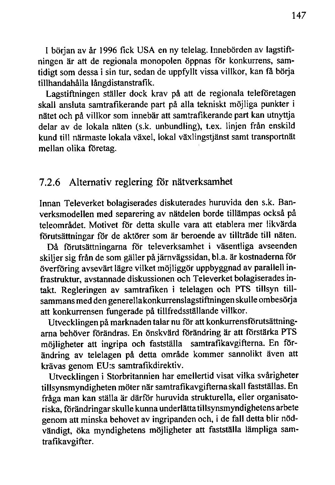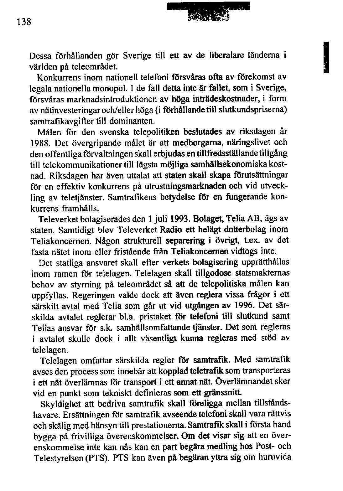 Då förutsättningarna för televerksamhet i väsentliga avseenden skiljer sig från de som gäller påjärnvägssidan,bl.a. är kostnadernaför överföring avsevärtlägre vilket möjliggör uppbyggnadav parallell infrastruktur, avstannadediskussionenoch Televerketbolagiseradesintakt. Regleringen av samtrafiken i telelagen och PTS tillsyn till-
