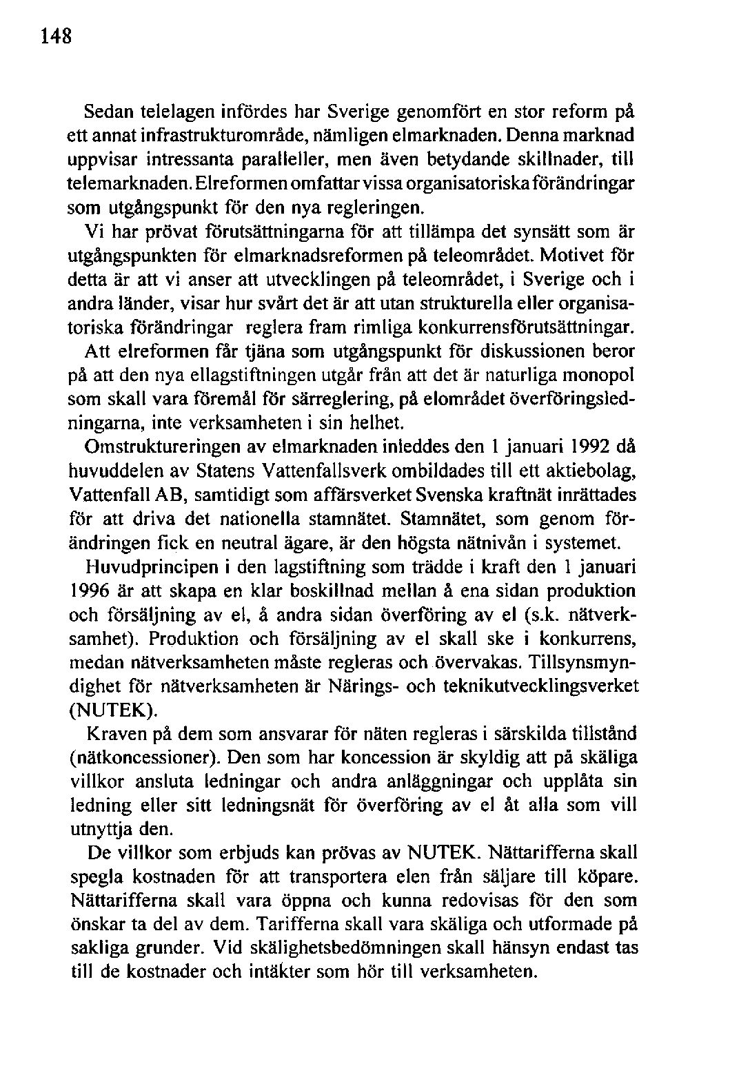 Sedantelelageninfördes har Sverige genomfört en stor reform på ett annatinfrastrukturområde,nämligenelmarknaden.Dennamarknad uppvisar intressanta paralleller, men även betydande skillnader, till telemarknaden.Elreformenomfattarvissaorganisatoriskaförändringar som utgångspunkt för den nya regleringen.