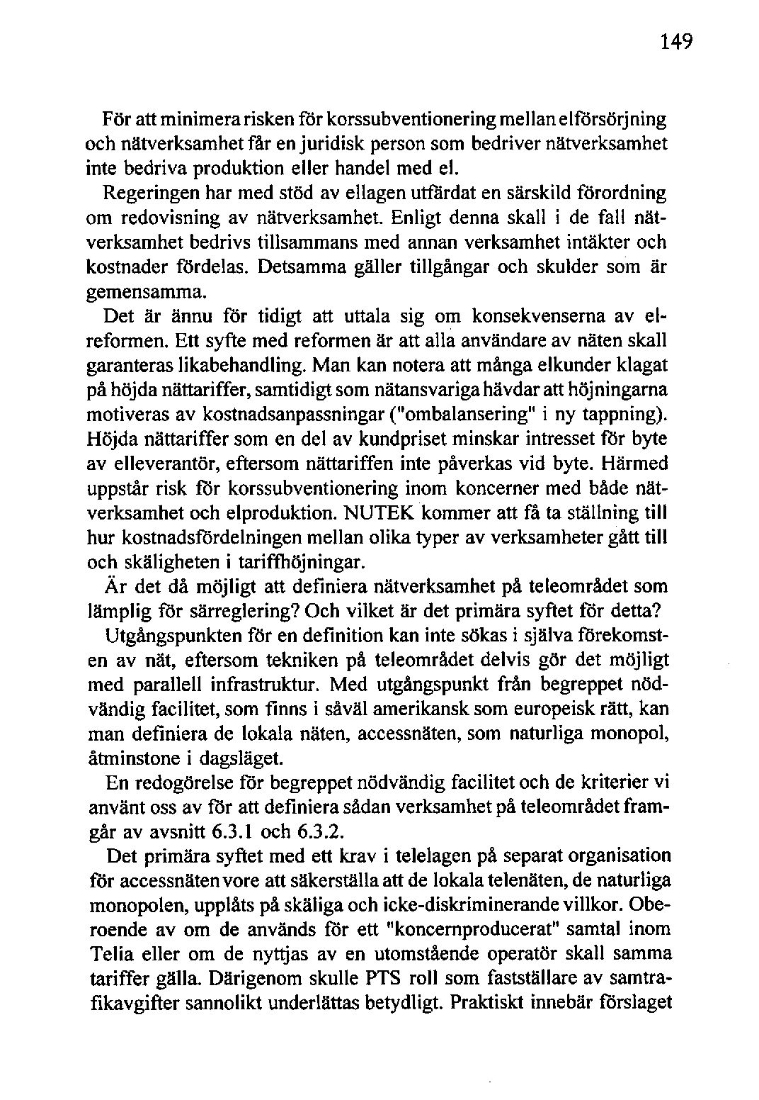 Utgångspunktenför en definition kan inte sökas i själva förekomsten av nät, eftersom tekniken på teleområdet delvis gör det möjligt med parallell infrastruktur. Med utgångspunkt från begreppetnödvändig facilitet, somfinns i såväl amerikansksom europeiskrätt, kan man definiera de lokala näten, accessnäten,som naturliga monopol, åtminstone i dagsläget.