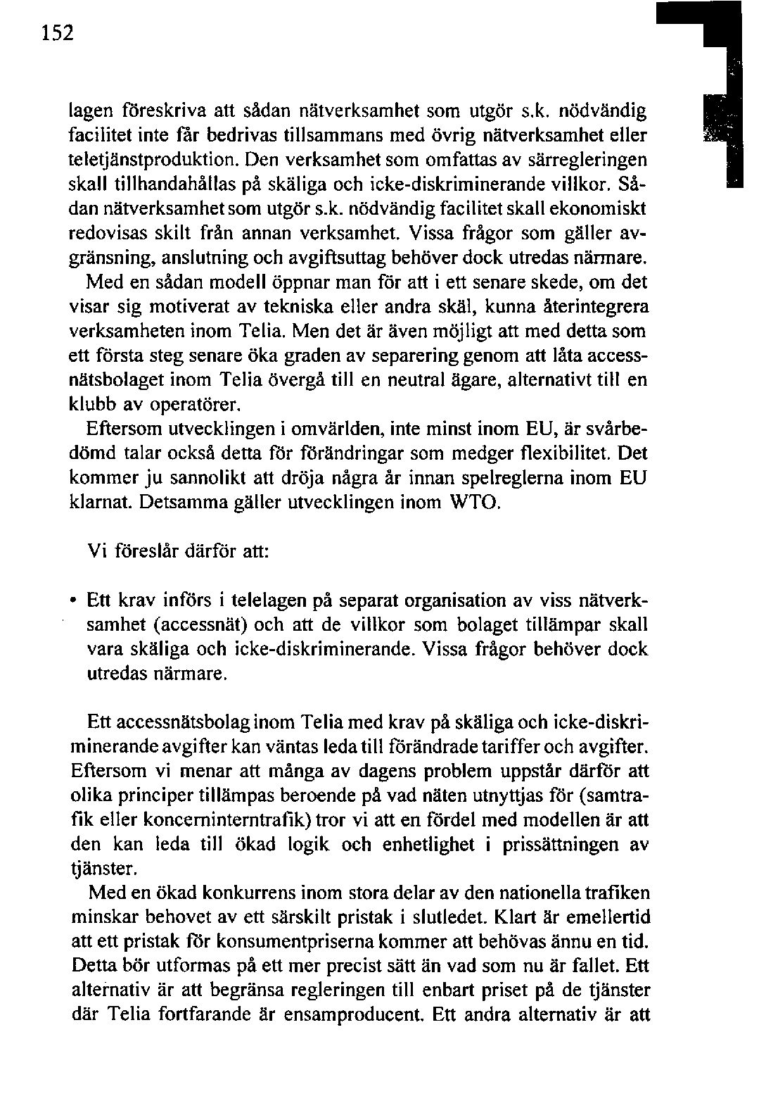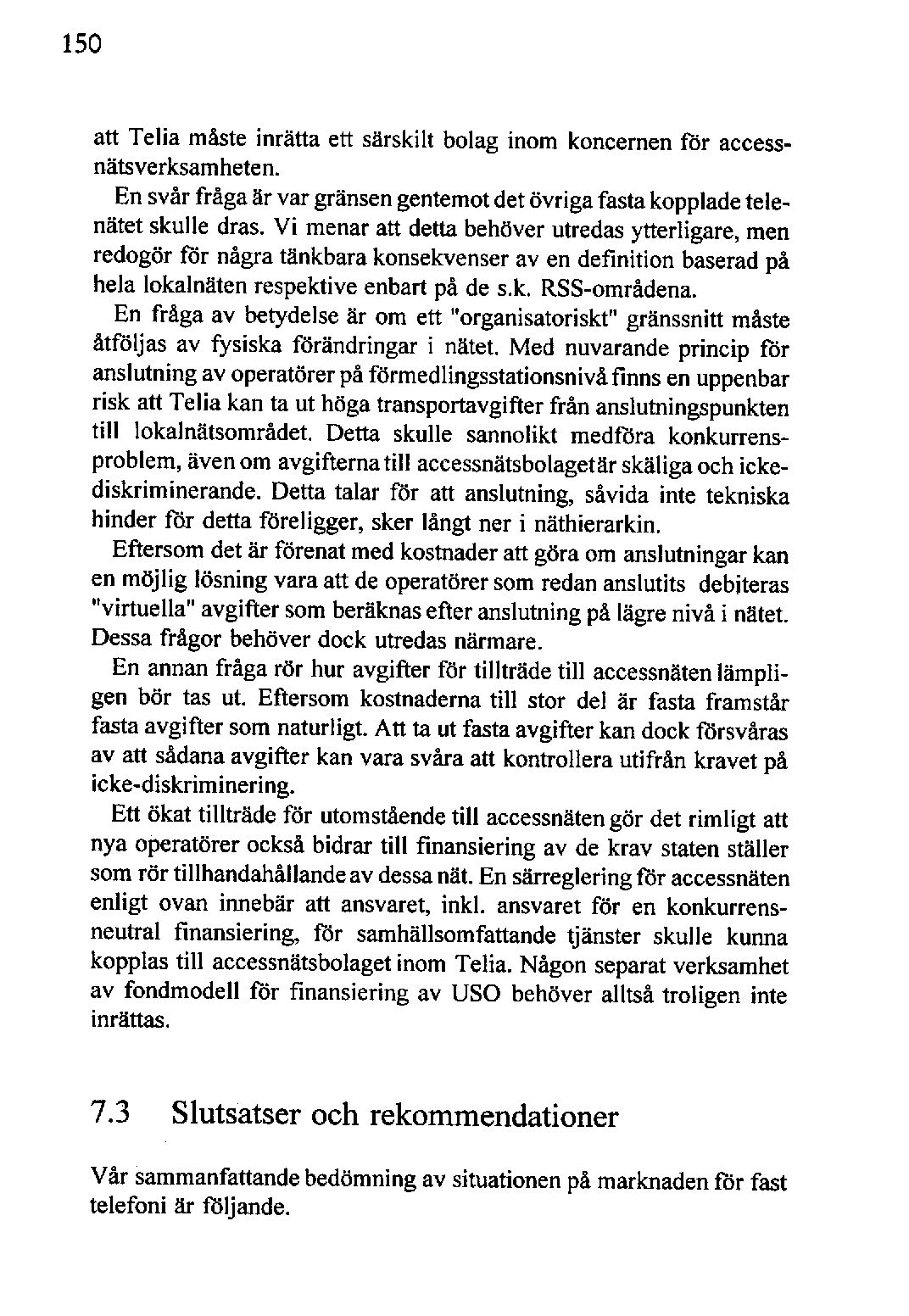 Ett ökat tillträde för utomståendetill accessnätengör det rimligt att nya operatörer också bidrar till finansiering av de krav statenställer som rör tillhandahållandeavdessanät. En särregleringför accessnäten enligt ovan innebär att ansvaret, inkl. ansvaret för en konkurrensneutral finansiering, för samhällsomfattande tjänster skulle kunna kopplas till accessnätsbolagetinom Telia. Någon separatverksamhet av fondmodell för finansiering av usa behöver alltså troligen inte inrättas.