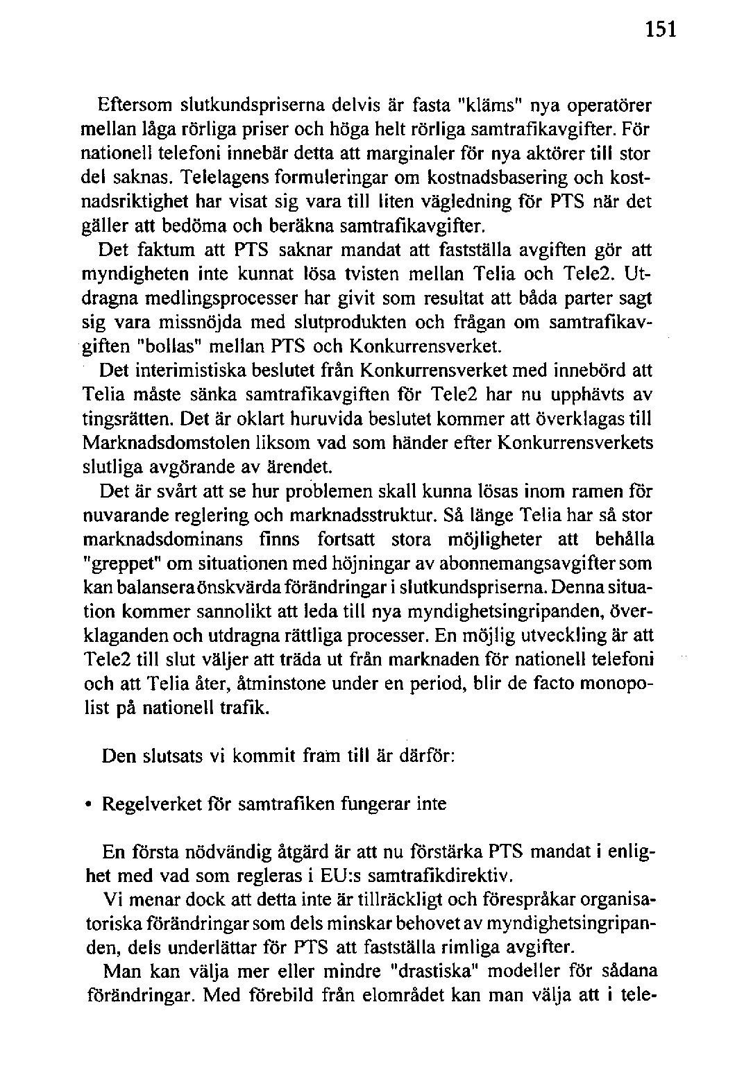 Det är svårt att se hur problemenskall kunna lösas inom ramen för nuvarandereglering och marknadsstruktur.Så länge Telia har så stor marknadsdominans finns fortsatt stora möjligheter att behålla "greppet" om situationenmed höjningar av abonnemangsavgiftersom kanbalanseraönskvärda förändringar i slutkundspriserna.Dennasituation kommer sannolikt att leda till nya myndighetsingripanden,överklagandenoch utdragnarättliga processer.En möjlig utveckling är att Tele2 till slut väljer att träda ut från marknadenför natione.11telefoni och att Telia åter, åtminstone under en period, blir de facto monopolist på nationell trafik.