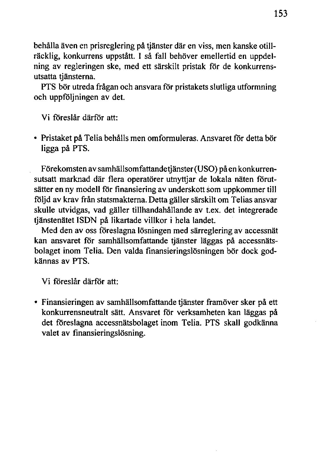 Förekomstenavsamhällsomfattandetjänster(USO)på enkonkurrensutsattmarknad där flera operatörer utnyttjar de lokala näten förutsätterenny modell för finansiering av underskottsom uppkommertill följd av krav från statsmakternaDetta. gäller särskilt om Telias ansvar skulle utvidgas, vad gäller tillhandahållande av t.ex. det integrerade tjänstenätet ISDN på likartade villkor i hela landet.