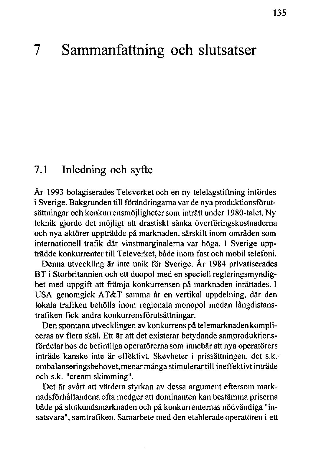 Denna utveckling är inte unik för Sverige. Ar 1984privatiserades BT i Storbritannien och ett duopol med en speciellregleringsmyndighet med uppgift att främja konkurrensenpå marknadeninrättades. I USA genomgick AT&T samma år en vertikal uppdelning, där den lokala trafiken behölls inom regionala monopol medan långdistanstrafiken fick andra konkurrensförutsättningar.