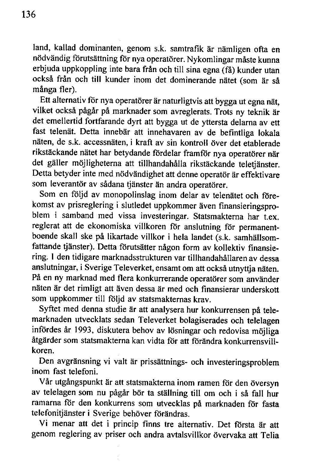 land, kallad dominanten, genom s.k. samtrafik är nämligen ofta en nödvändig förutsättning för nya operatörer.Nykomlingar måstekunna erbjuda uppkoppling inte bara från och till sina egna (få) kunder utan också från och till kunder inom det dominerande nätet (som är så