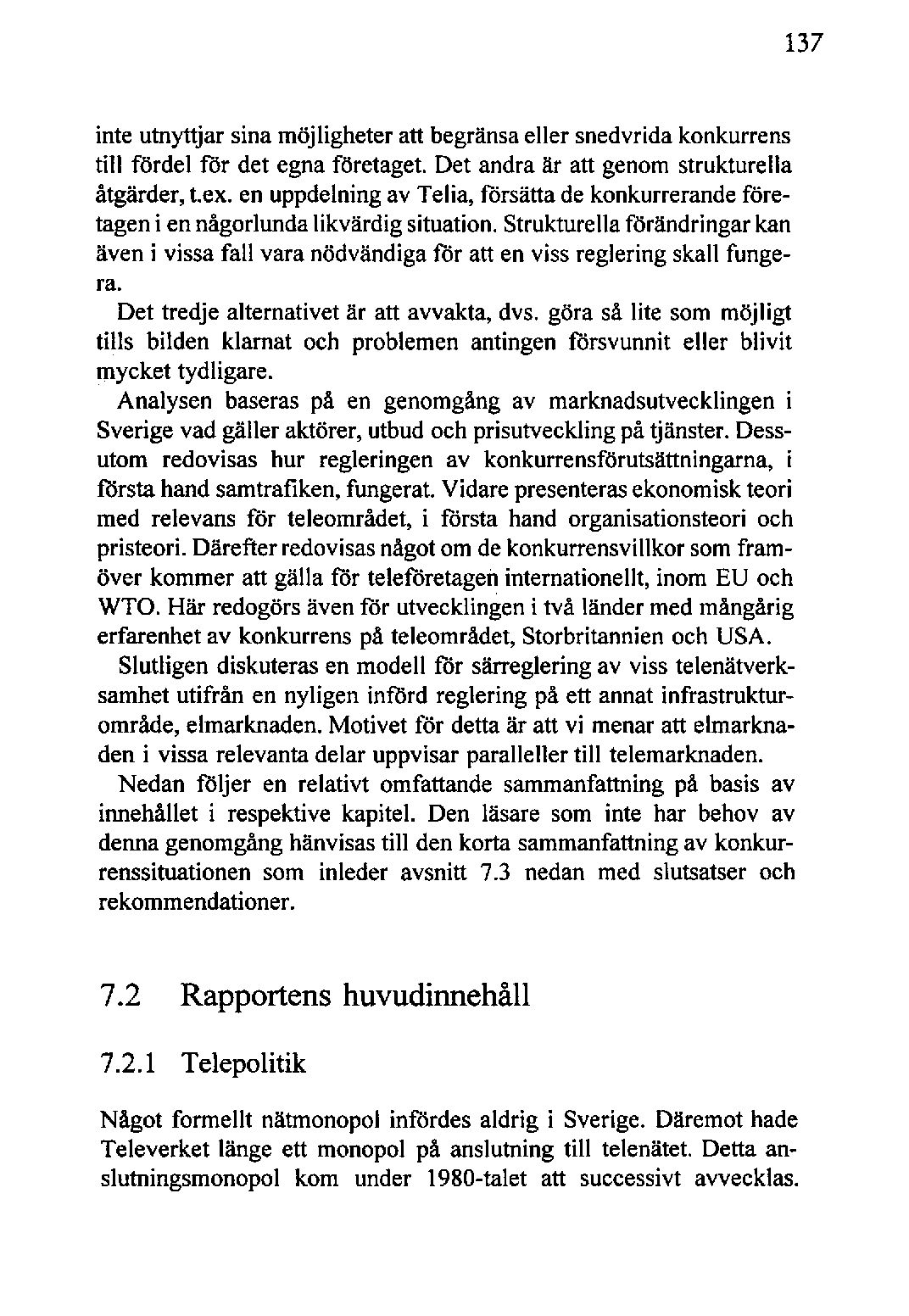 inte utnyttjar sina möjligheter att begränsaeller snedvridakonkurrens till fördel för det egnaföretaget. Det andra är att genom strukturella åtgärder, t.ex. enuppdelning av Telia, försätta de konkurrerandeföretageni ennågorlundalikvärdig situation.Strukturella förändringar kan även i vissa fall vara nödvändiga för att en viss reglering skall fungera.