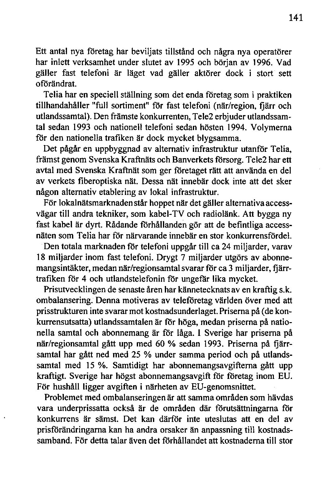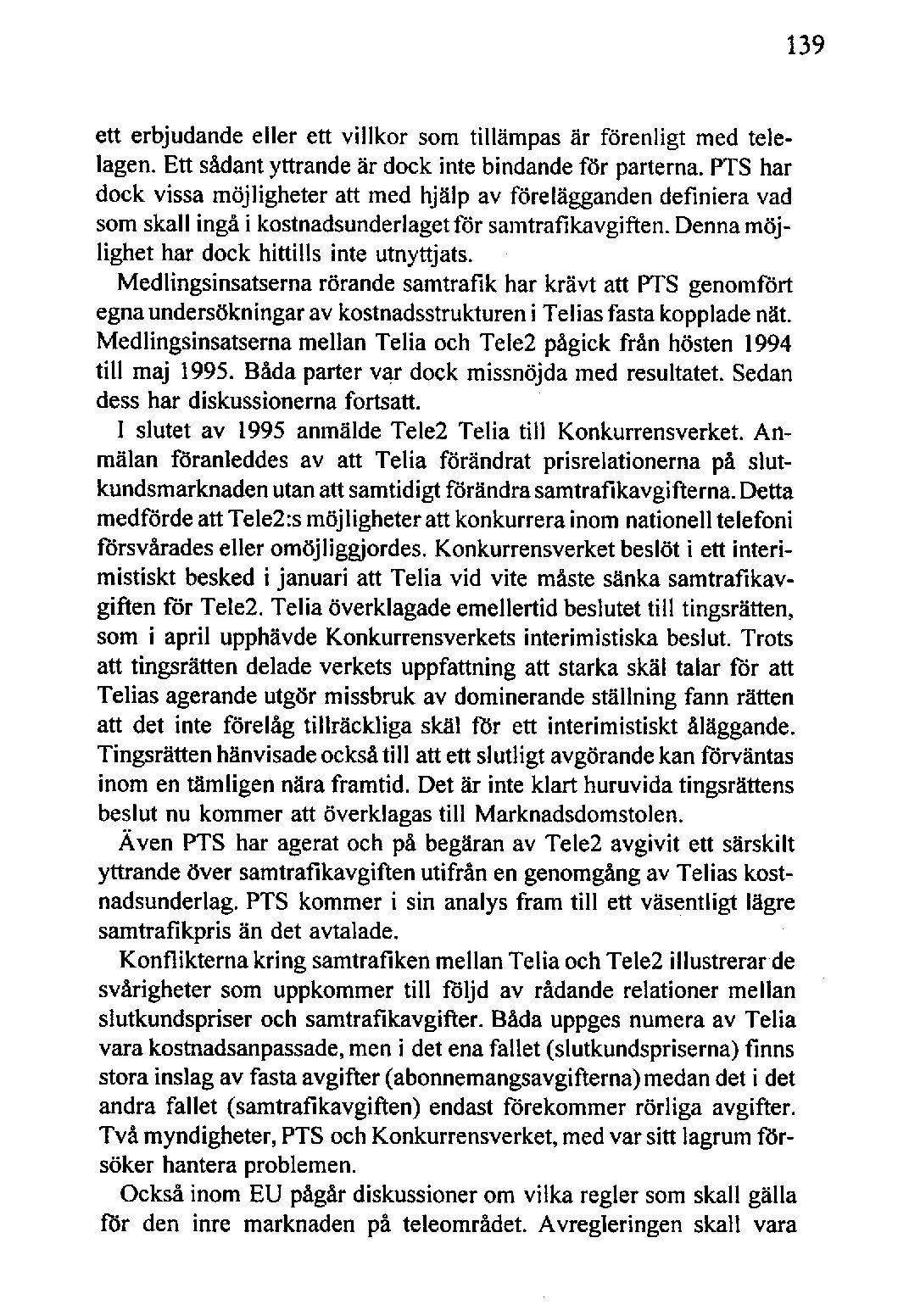 I slutet av 1995 anmälde Tele2 Telia till Konkurrensverket. An- mälan föranleddes av att Telia förändrat prisrelationerna på slutkundsmarknadenutanattsamtidigtförändra samtrafikavgifterna.Detta medförde attTele2:s möjligheter attkonkurrerainom nationell telefoni försvårades eller omöjliggjordes. Konkurrensverketbeslöt i ett interimistiskt besked i januari att Telia vid vite måste sänka samtrafikavgiften för Tele2. Telia överklagadeemellertid beslutettill tingsrätten, som i april upphävde Konkurrensverketsinterimistiska beslut. Trots att tingsrätten delade verkets uppfattning att starka skäl talar för att Telias agerandeutgör missbruk av dominerandeställning fann rätten att det inte förelåg tillräckliga skäl för ett interimistiskt åläggande. Tingsrättenhänvisadeockså till att ett slutligt avgörandekan förväntas inom en tämligen nära framtid. Det är inte klart huruvida tingsrättens beslut nu kommer att överklagas till Marknadsdomstolen.
