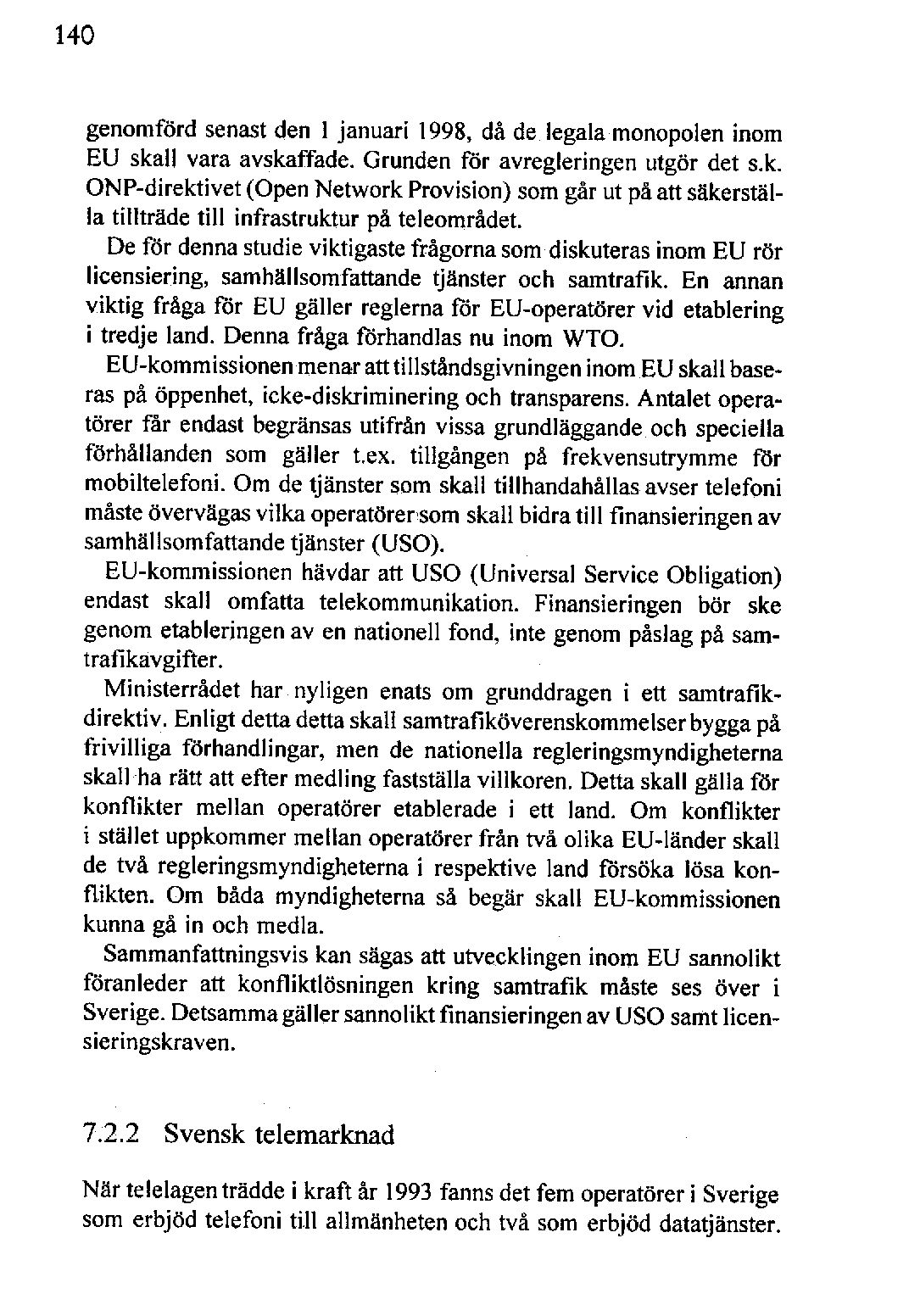 genomförd senastden l januari 1998, då de legala monopolen inom EU skall vara avskaffade. Grunden för avregleringen utgör det s.k.