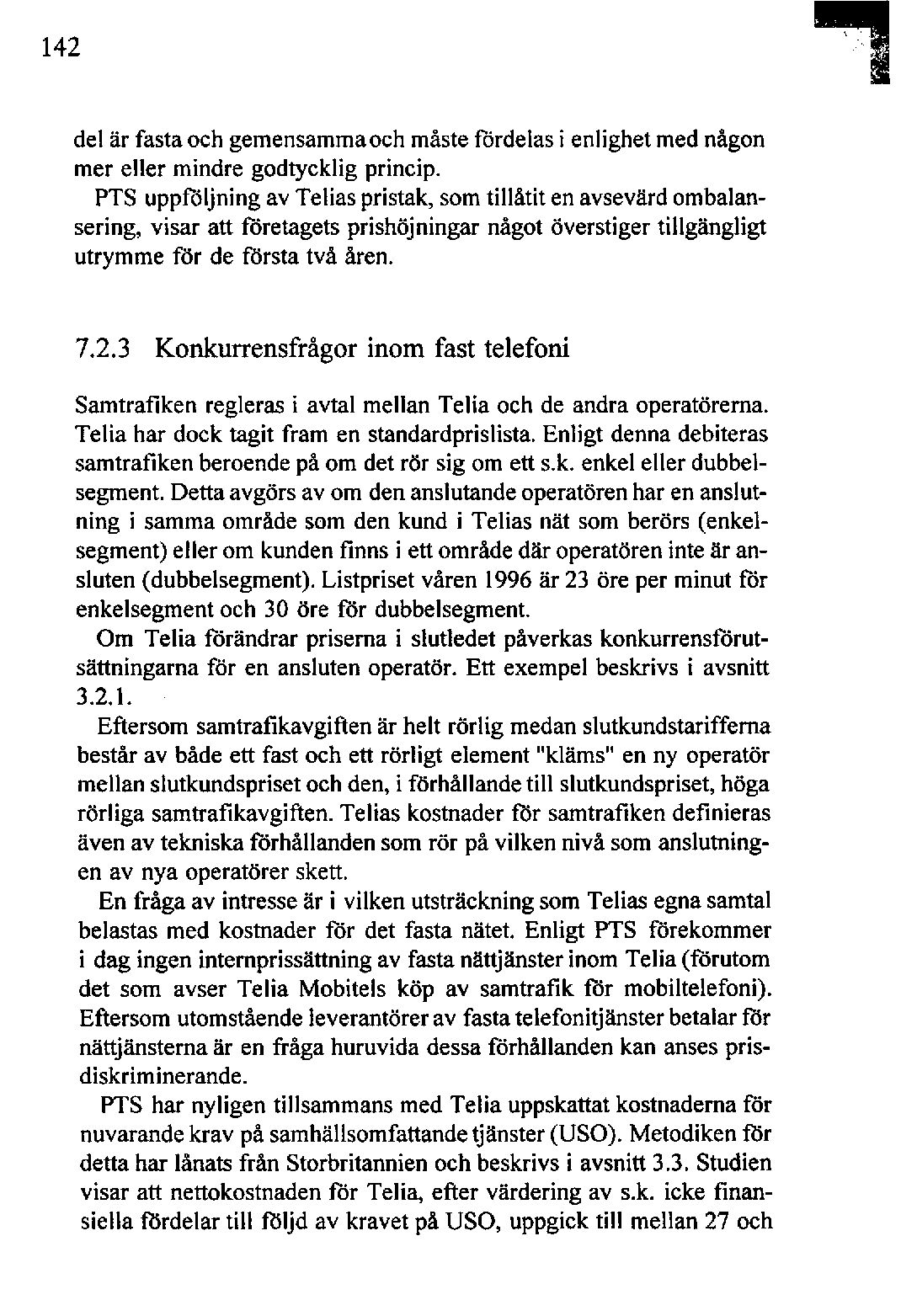En fråga av intresseär i vilken utsträckning somTelias egna samtal belastasmed kostnader för det fasta nätet. Enligt PTS förekommer i dag ingen internprissättningav fasta nättjänsterinom Telia (förutom det som avser Telia Mobitels köp av samtrafik för mobiltelefoni). Eftersomutomståendeleverantörerav fasta telefonitjänster betalarför nättjänsterna är en fråga huruvida dessaförhållanden kan ansesprisdiskriminerande.