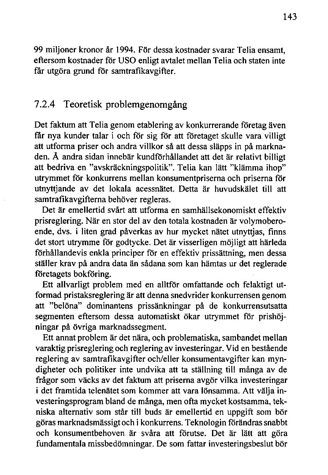 99 miljoner kronor år 1994. För dessakostnadersvararTelia ensamt, eftersomkostnaderför usa enligt avtaletmellan Telia och stateninte får utgöra grund för samtrafikavgifter.
