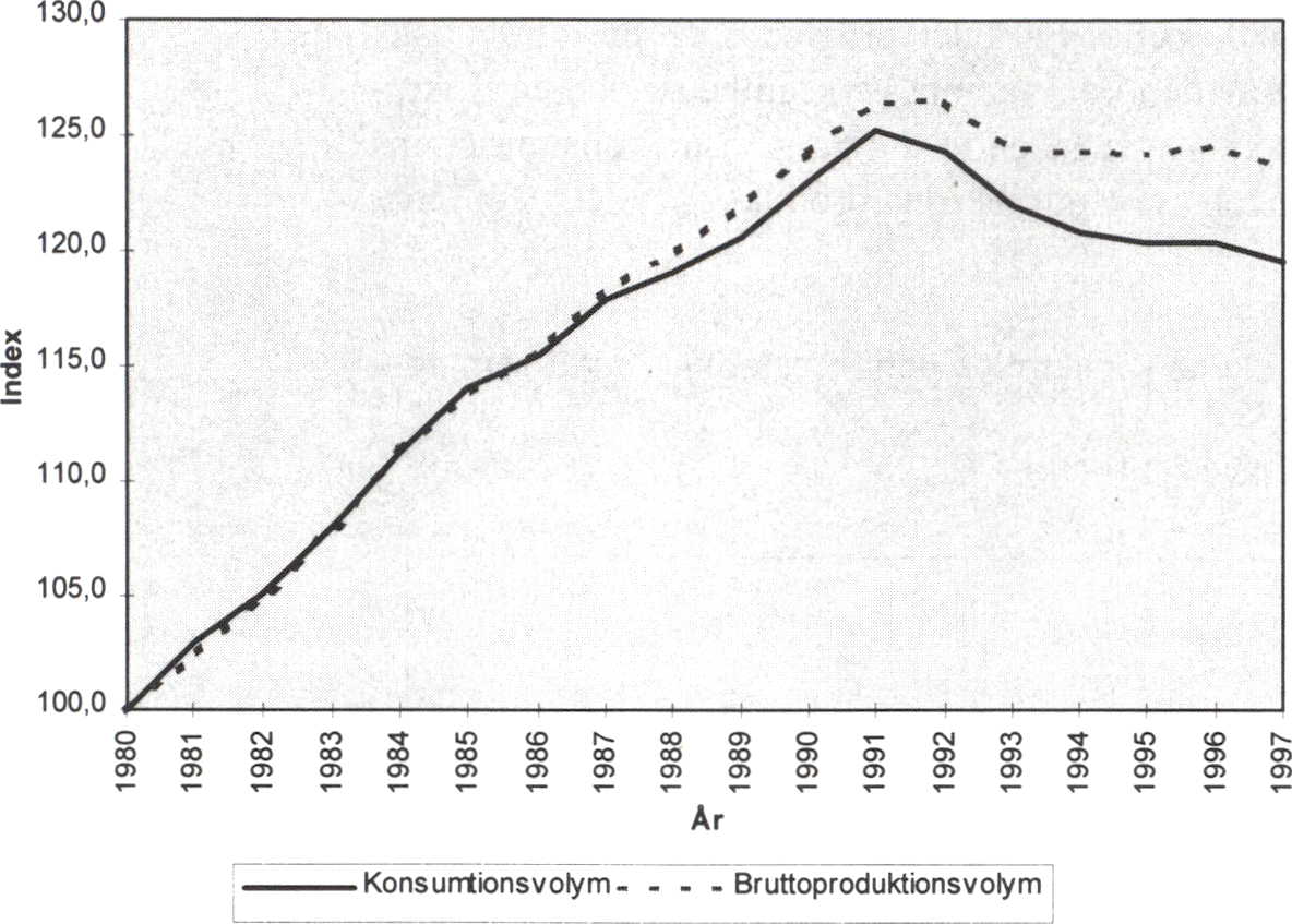 Totalt har konsumtionsvolymen minskat med 4,6 procent sedan år 1991.