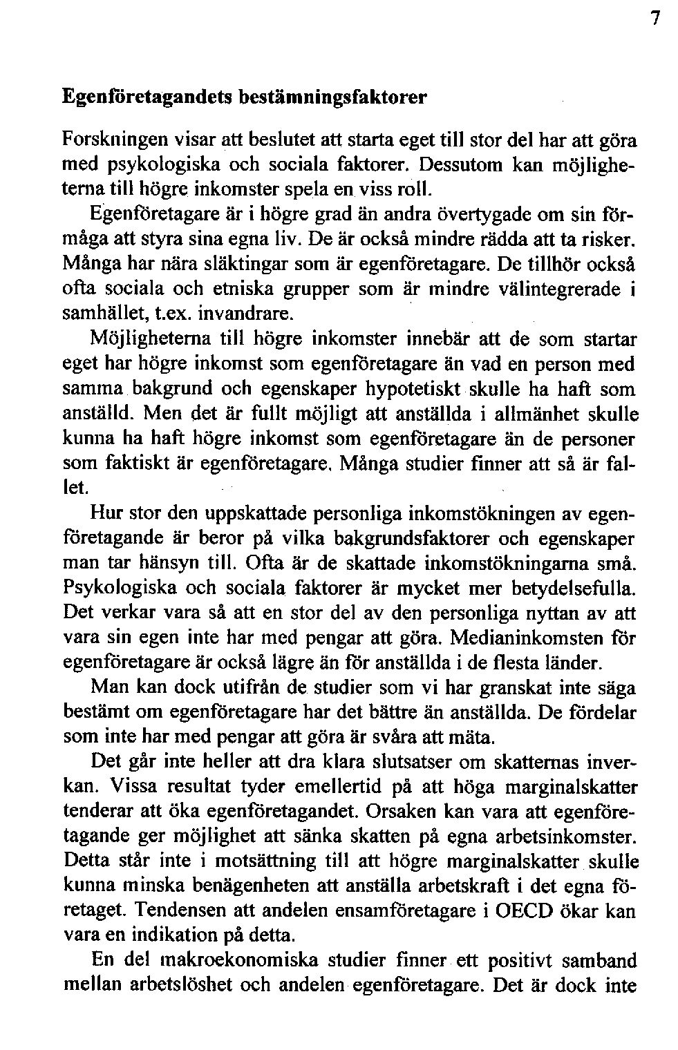 Det går inte heller att dra klara slutsatserom skattemasinverkan. Vissa resultat tyder emellertid på att höga marginalskatter tenderaratt öka egenföretagandetOrsaken.kanvara att egenföretagandeger möjlighet att sänka skattenpå egnaarbetsinkomster. Detta står inte i motsättningtill att högre marginalskatterskulle kunnaminska benägenhetenatt anställa arbetskrafti det egnaföretaget.Tendensenatt andelenensamföretagarei OECD ökar kan varaen indikationpå detta.