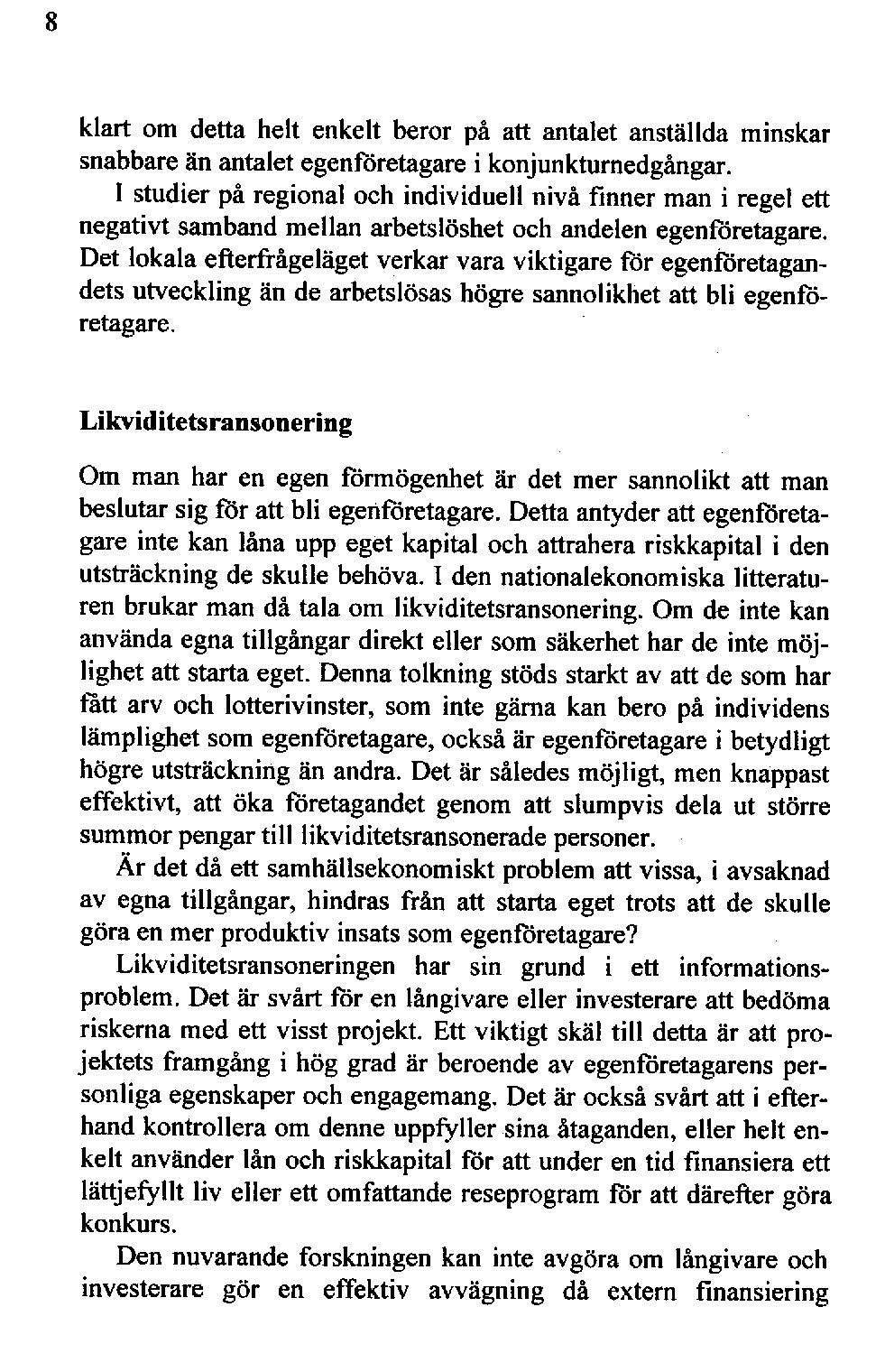 Om man har en egen förmögenhetär det mer sannolikt att man beslutarsig för att bli egenföretagareDetta. antyderatt egenföretagareinte kan låna upp egetkapital och attraherariskkapital i den utsträckningde skulle behöva.I dennationalekonomiskalitteraturen brukar man då tala om likviditetsransonering.Om de inte kan användaegnatillgångar direkt eller som säkerhetharde inte möjlighet att startaeget.Dennatolkning stöds starktav att de somhar fått arv och lotterivinster, som inte gärna kan bero på individens lämplighet somegenföretagare,ocksåär egenföretagarei betydligt högre utsträckningän andra.Det är såledesmöjligt, menknappast effektivt, att öka företagandetgenom att slumpvis dela ut större summorpengartilllikviditetsransoneradepersoner.