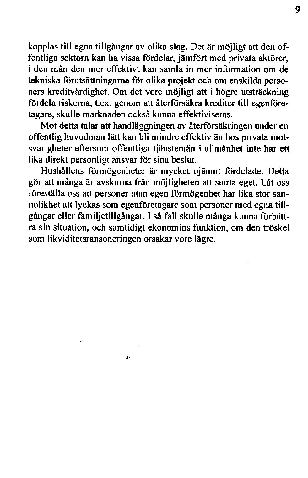 kopplastill egnatillgångar av olika slag.Det är möjligt att denoffentliga sektornkanha vissafördelar,jämfört medprivataaktörer, i den mån den mer effektivt kan samlain mer information om de tekniskaförutsättningarnaför olika projekt ochomenskildapersonerskreditvärdighet.Om detvore möjligt att i högre utsträckning fördela riskerna,t.ex. genomatt återförsäkrakreditertill egenföretagare,skulle marknadenocksåkunnaeffektiviseras.