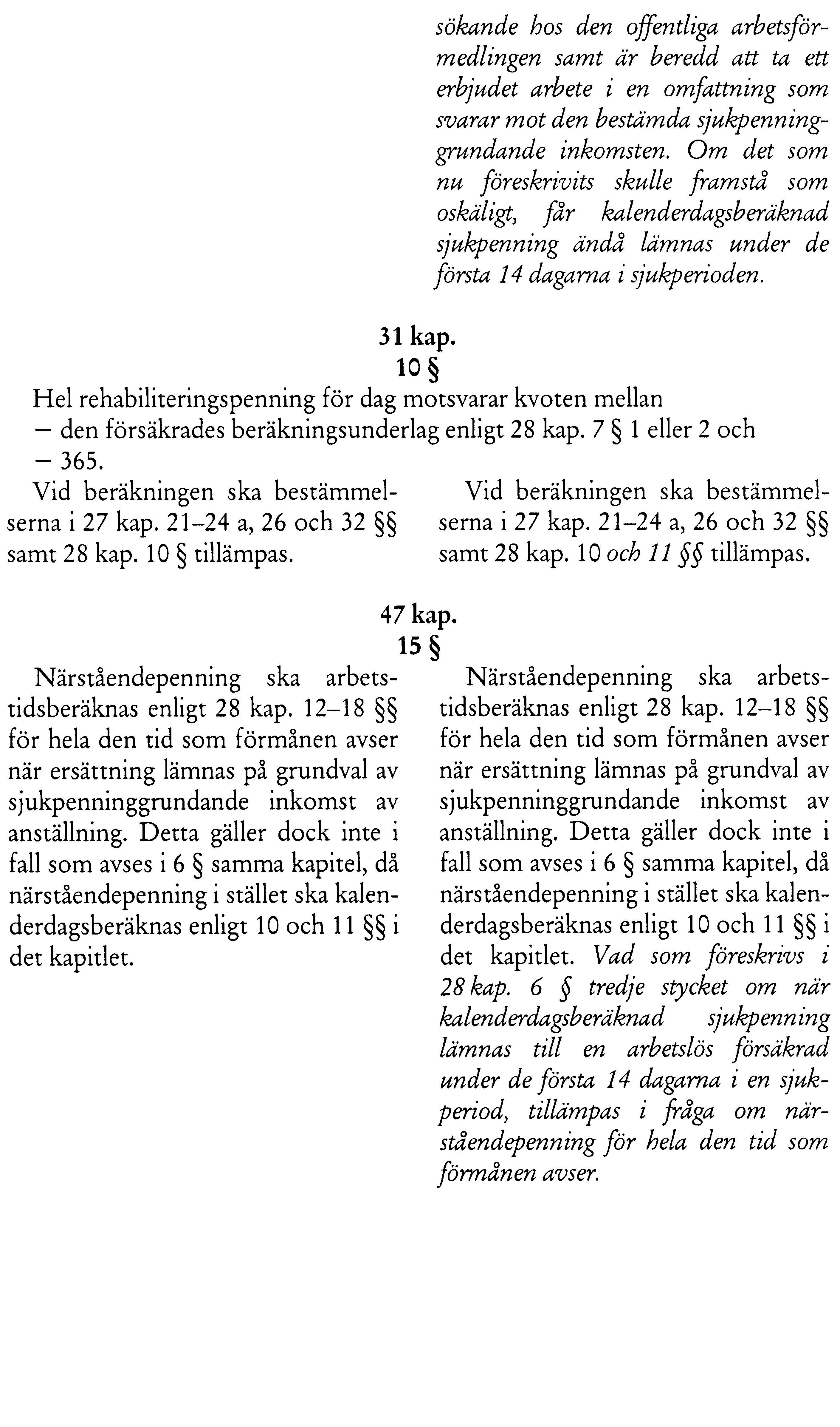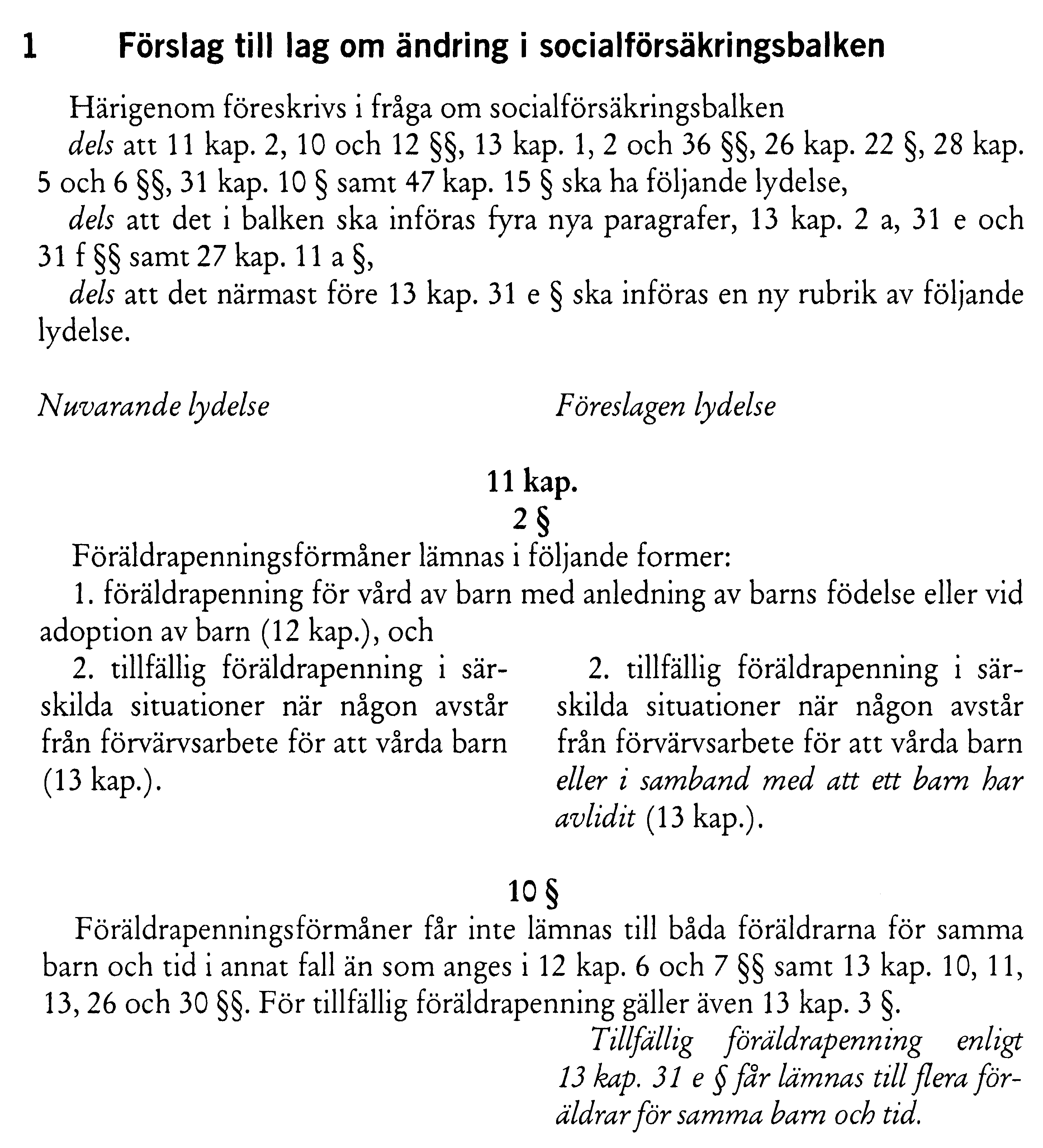 | a) Lagförslag Riksdagen antar regeringens förslag till 1. lag om ändring i socialförsäkringsbalken, 2. lag om ändring i lagen (2010:000) om ändring i föräldraledighetslagen (1995:584). b) Bemyndigande Riksdagen bemyndigar regeringen att under 2011 dels för ramanslaget 1:1 Sjukpenning och rehabilitering m.m. ingå ekonomiska förpliktelser som, inklusive tidigare åtaganden, medför behov av framtida anslag på högst 1 020 000 000 kr under 2012, dels för ramanslaget 2:1 Försäkringskassan ingå ekonomiska förpliktelser som, inklusive tidigare åtaganden, medför behov av framtida anslag på högst 8 900 000 kr under perioden 2012–2013. c) Anslag Riksdagen anvisar för 2011 anslagen under utgiftsområde 10 Ekonomisk trygghet vid sjukdom och handikapp enligt utskottets förslag i bilaga 3. Därmed bifaller riksdagen proposition 2010/11:1 utgiftsområde 10 punkterna 1–5 och avslår motionerna 2010/11:Fi230 av Mona Sahlin m.fl. (S, MP, V) yrkande 11, 2010/11:Sf347 av Tomas Eneroth m.fl. (S, MP, V) yrkandena 1 och 2 samt 2010/11:Sf372 av Johnny Skalin och Björn Söder (båda SD). |
