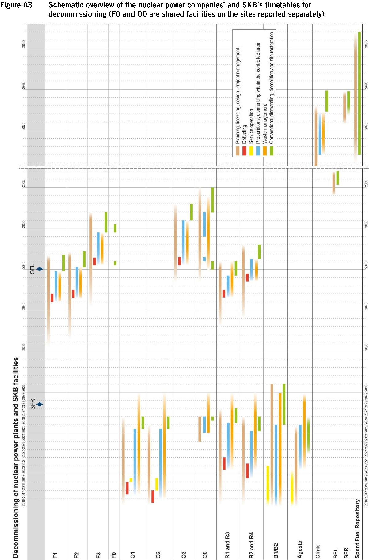 In October 2015 the nuclear power plant licensees decided to permanently close down the four oldest reactors at Oskarshamn (BWR units 1 and 2) in 2017 and at Ringhals (BWR unit 1 and PWR unit 2) before the end of 2020. Decommissioning activities at the two BWR units at Barsebäck, which were shut down in 1999 and 2005, have started with an interim storage facility established on the site in 2015. Dismantling and segmentation of internal reactor parts from reactor 2 commenced in 2016. The Ågesta PHWR has been in service operation since 1974. Preparations are now being made for the start of dismantling in 2020. The dismantling of Studsvik’s R2 materials testing reactors started in February 2015 and is planned to continue until 2019, aiming for