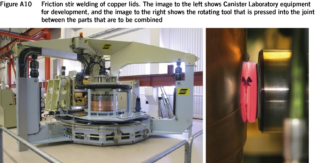 Upper right: The Canister Laboratory equipment for development of friction stir welding of copper lids of spent nuclear fuel copper canisters.