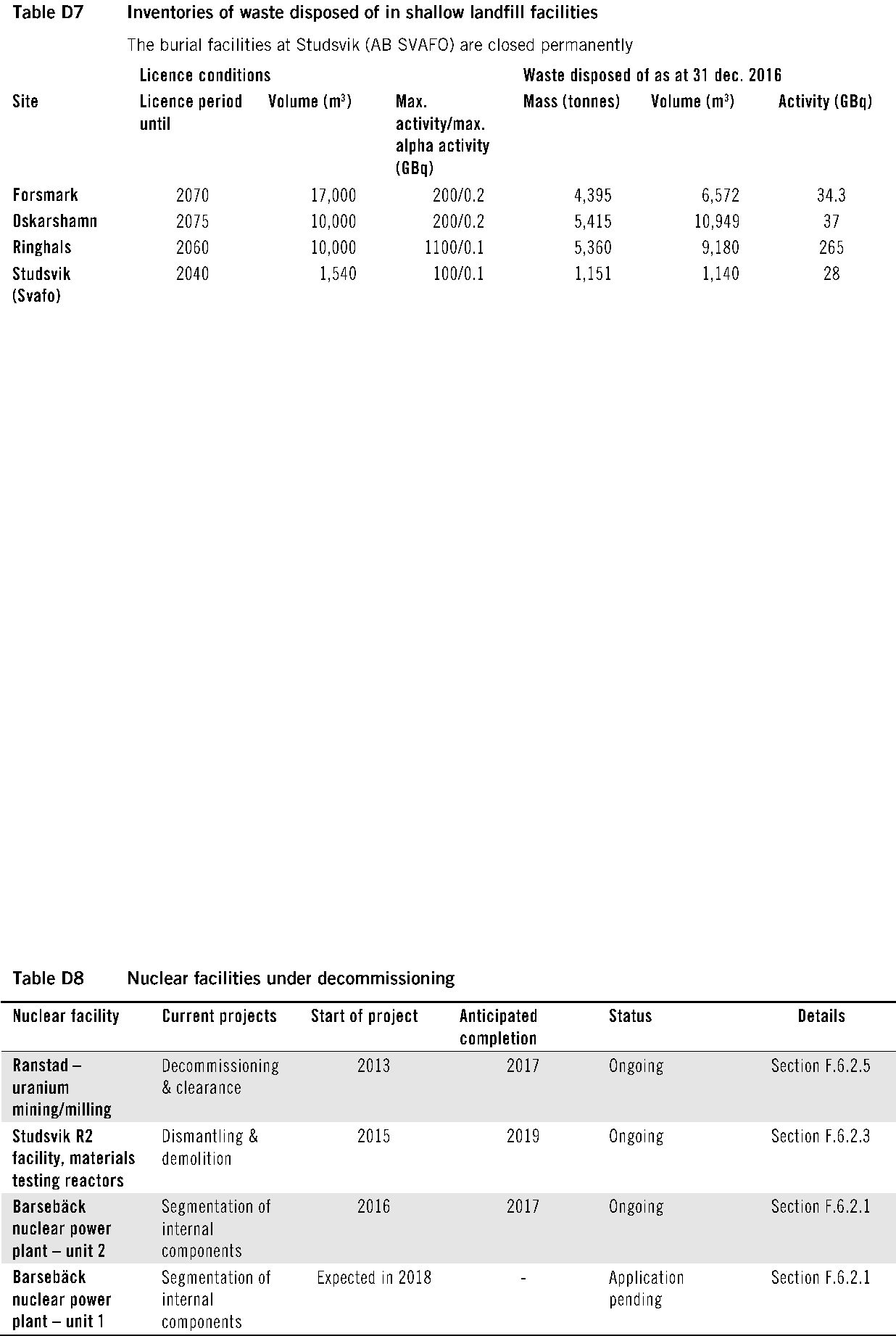The current report reflects an intensive phase of licensing in the Swedish programme for management of spent nuclear fuel. After six years of review by the Swedish regulator, the Land and Environment Court is now preparing for its main hearings in autumn 2017 on the licence application for a spent nuclear fuel repository at Forsmark and an encapsulation plant at Oskarshamn. The Swedish regulator and the Court expect to submit their final recommen- dations for a Government decision in 2018. In parallel, the Swedish regulator is also con- ducting a regulatory review of the nuclear industry’s application to extend the existing reposi- tory (the SFR facility) for low and intermediate level waste at Forsmark.