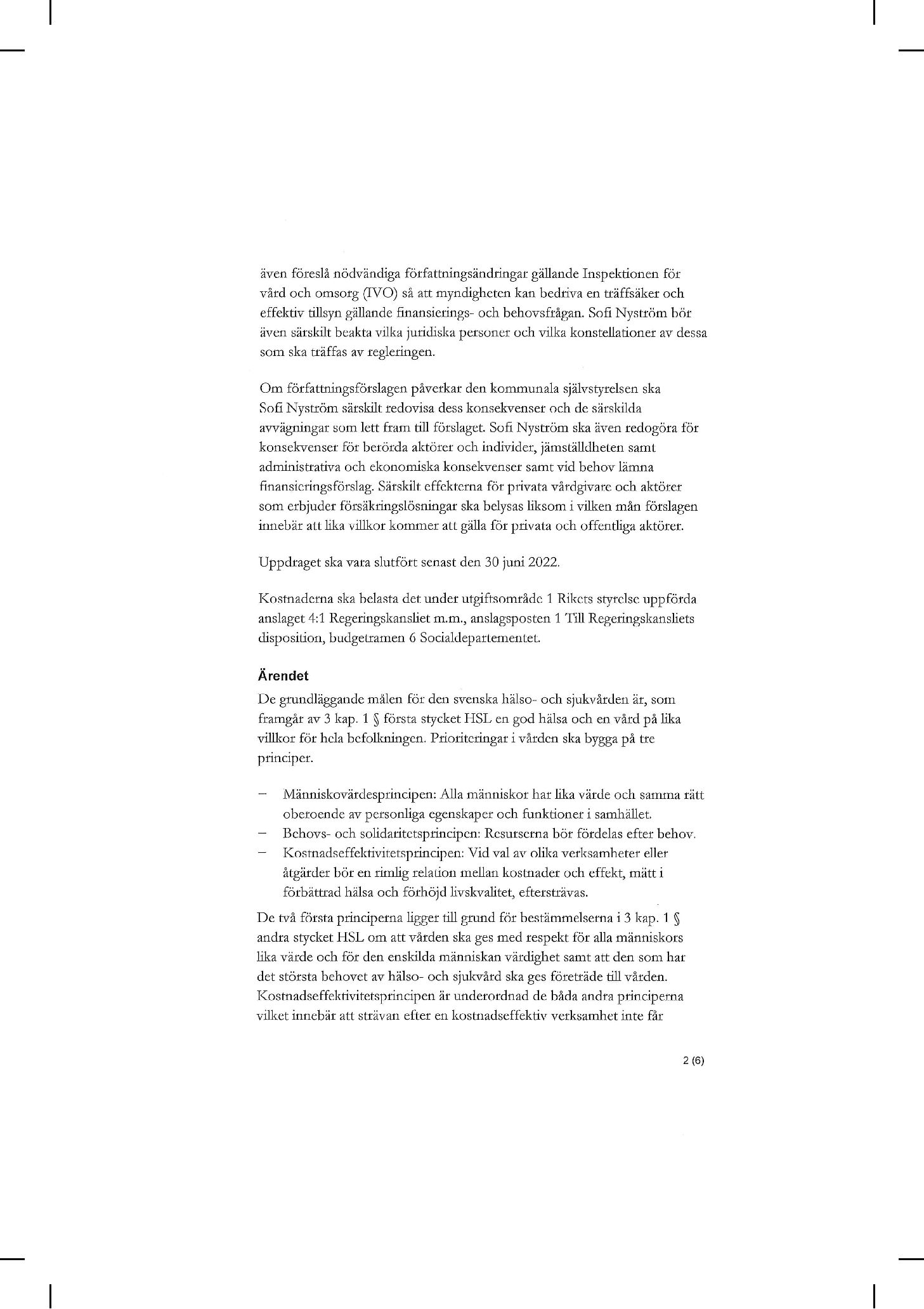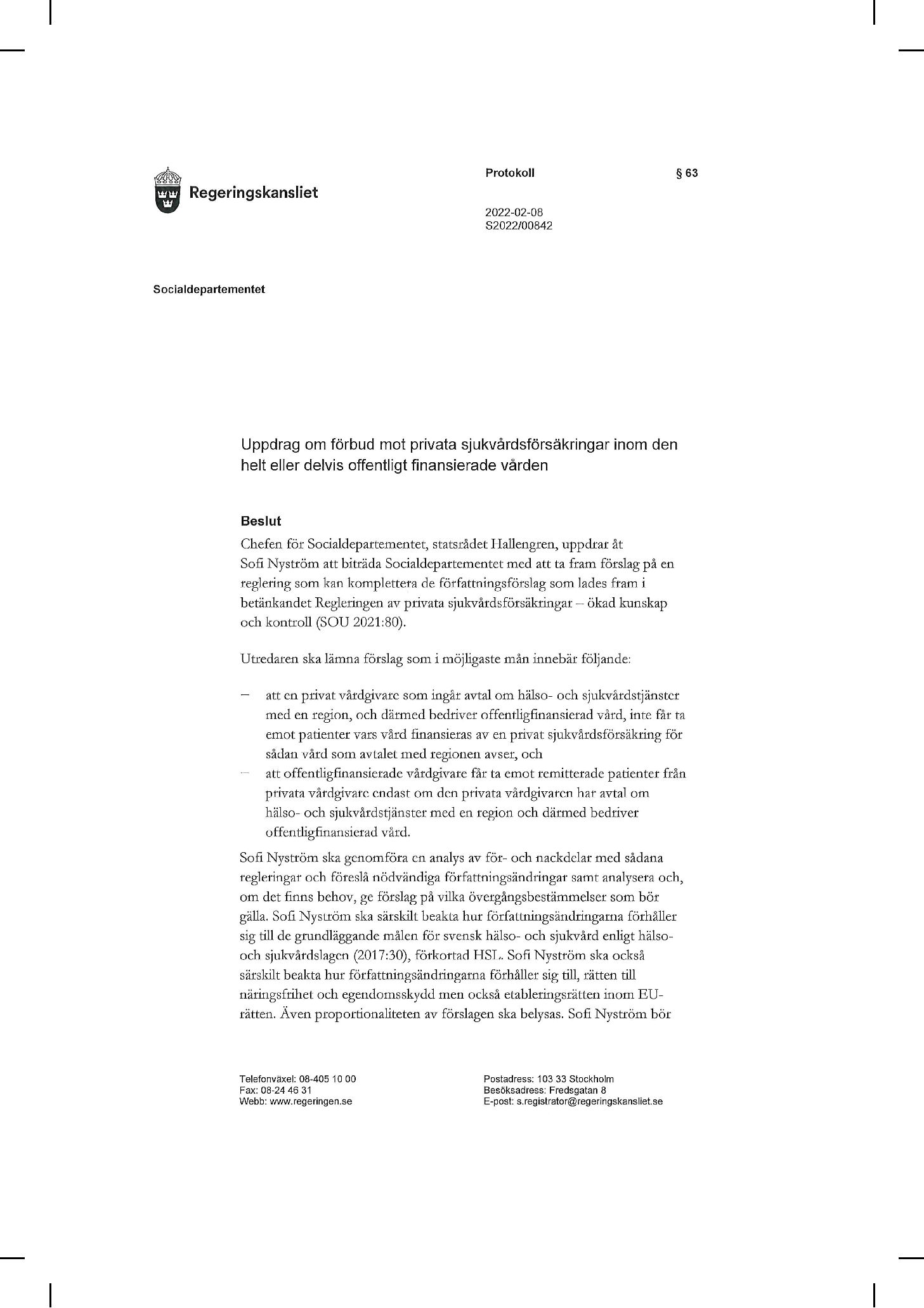 Socialministern, statsrådet Lena Hallengren, gav den 8 februari 2022 juristen Sofi Nyström i uppdrag att ta fram förslag på reglering av privata sjukvårdsförsäkringar inom den helt eller delvis offentligt finansierade vården. Förslagen ska komplettera de författningsförslag som har lagts fram i betänkandet Reglering av privata sjukvårdsförsäkringar – ökad kunskap och kontroll (SOU 2021:80). Juristen Stina Lempert Taxén har sedan den 3 mars 2022 arbetat som sekreterare i uppdraget.