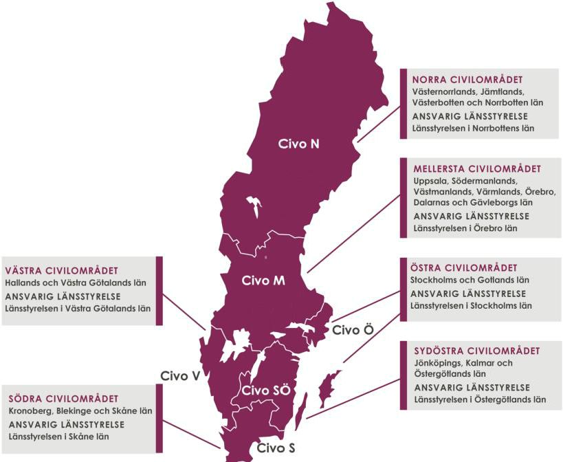 •indelning av landet i sex geografiska områden (civilområden) med sex utpekade civilområdesansvariga länsstyrelser