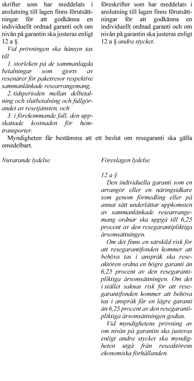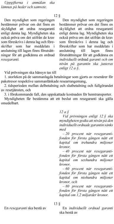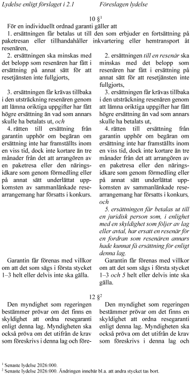 Lagändringarna innebär bl.a. att resegarantisystemet förändras på så sätt att en kollektiv fond inrättas och de individuella garantierna som varje reseaktör ordnar minskar i storlek. Vidare utvidgas tillämpningsområdet för resegarantisystemet så att fler återbetalningskrav och vissa typer av värdebevis kan ersättas, och det införs en regressrätt för juridiska personer som ersatt en resenär för en fordran som resenären annars hade kunnat få ersättning för enligt resegarantilagen.