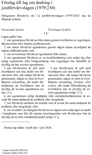 Lagändringen innebär att vissa förvärv av lantbruksegendom ska undantas från jordförvärvslagens tillämpningsområde. Det gäller förvärv som görs av ett syskon eller en förälder till överlåtaren eller, om makar förvärvar gemensamt, förvärv där någon av makarna är överlåtarens förälder eller syskon. Sådana förvärv ska inte längre kräva förvärvstillstånd.