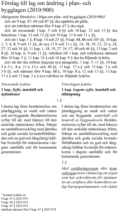 Övergripande handlar förändringarna om en vidareutveckling av reformen certifierade byggprojekteringsföretag och om en förstärkning av kontrollen vid byggande och förvaltning.
