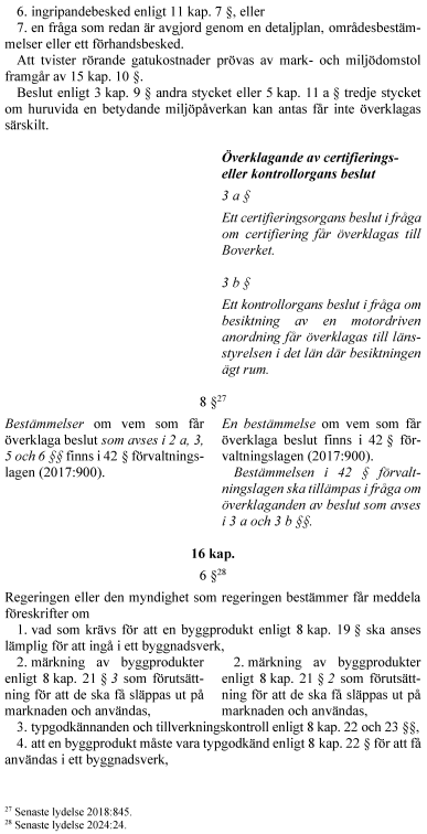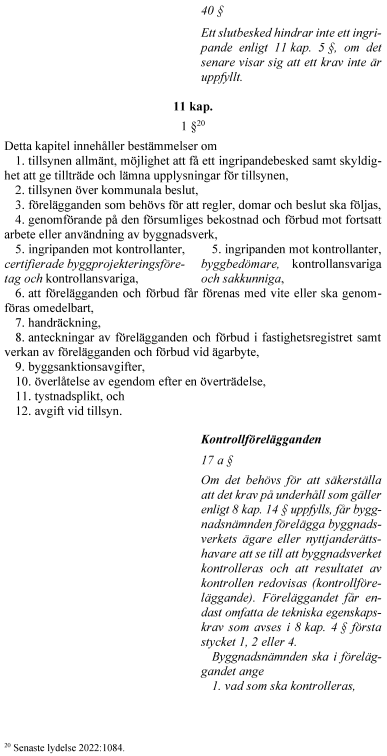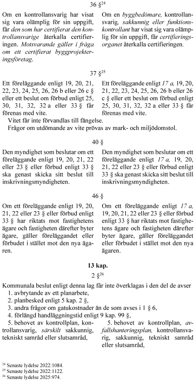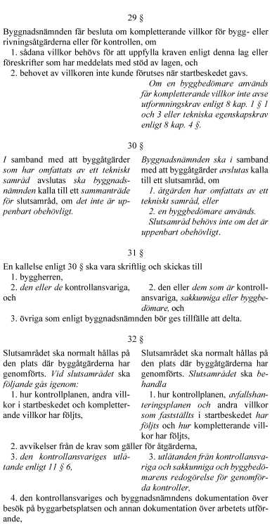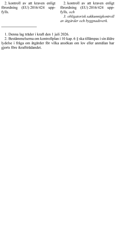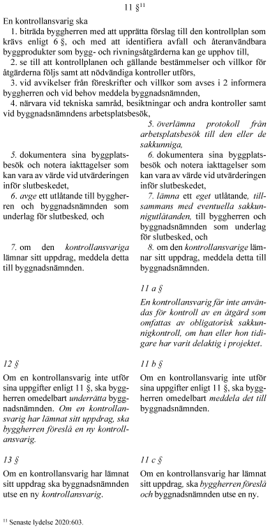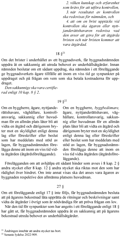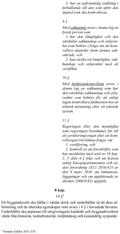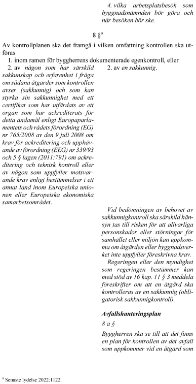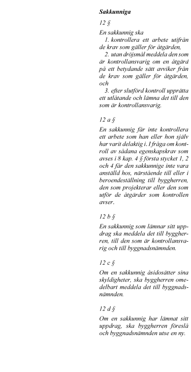 Vidare föreslår regeringen att rollen som sakkunnig förstärks. För vissa byggåtgärder blir sakkunnigkontroll obligatorisk. Kraven på kontrollplan utvecklas i fråga om vad kontrollerna ska omfatta och hur de ska utföras. Kontrollplanen delas upp i två planer – en för kontroll och en för avfall. En kontrollansvarig får inte kontrollera genomförandet av åtgärder som den har projekterat. Reglerna om tekniskt samråd tydliggörs i fråga om handlingar inför samrådet och vad det ska omfatta. Byggherrens ansvar för projektering och genomförande förtydligas. Innebörden av arbetsplatsbesök förstärks och det tydliggörs att ett slutbesked inte hindrar senare ingripanden. Anordningar som är väsentliga för bärförmåga, stadga och beständighet ska underhållas så att de alltid uppfyller sitt ändamål. Byggnadsnämnden får genom ett kontrollföreläggande kräva att ett byggnadsverks ägare eller nyttjanderättshavare ska kontrollera att sådana underhållskrav uppfylls. Det tydliggörs att certifieringsverksamhet kan innefatta myndighetsutövning och att sådana beslut får överklagas.