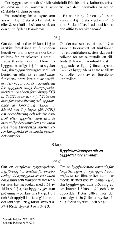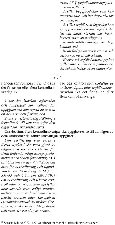 Syftet är vidare att förstärka kontrollen av vissa tekniska egenskapskrav vid byggande och förvaltning. Bland annat förtydligas byggherrens ansvar och rollen som sakkunnig förstärks. Dessutom delas kraven på kontrollplan upp i två planer – en för kontroll och en för avfall. Den kontrollansvariga ska inte få kontrollera sitt eget projekteringsarbete.