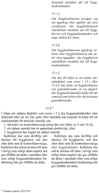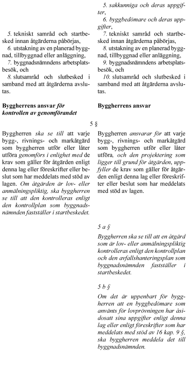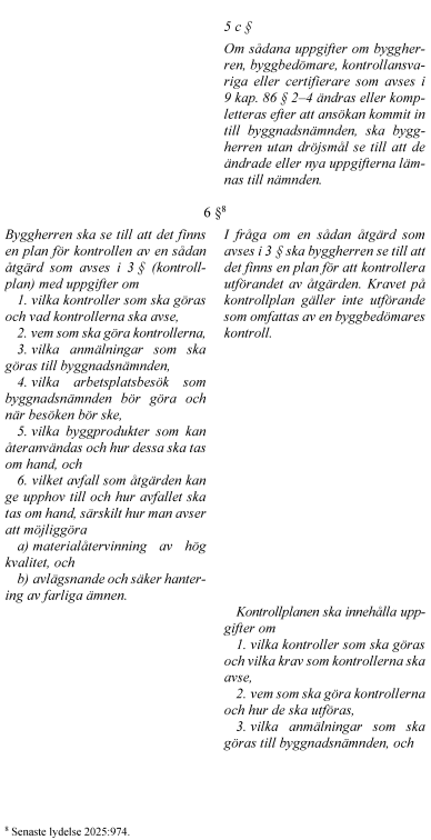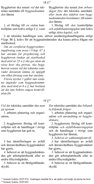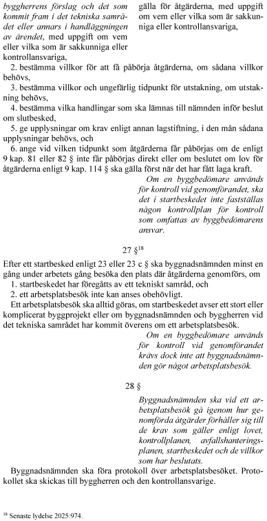 6. byggbedömare och deras uppgifter, 7. tekniskt samråd och startbesked innan åtgärderna påbörjas, 8. utstakning av en planerad byggnad, tillbyggnad eller anläggning, 9. byggnadsnämndens arbetsplatsbesök, och 10. slutsamråd och slutbesked i samband med att åtgärderna avslutas.