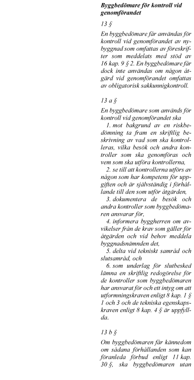 Förslaget innebär vissa avgränsningar av användningsområdet för byggbedömare. Exempelvis föreslår regeringen att vissa åtgärder som typiskt sett är särskilt riskfyllda ska omfattas av krav på obligatorisk sakkunnigkontroll. Då bör inte byggbedömare få användas. Vidare föreslås bestämmelser för det fall att en byggbedömare missköter sig eller upphör med sin kontroll. Det införs en möjlighet för byggnadsnämnden att ingripa mot en byggbedömare som inte uppfyller sina skyldigheter i form av ett åtgärds-föreläggande som kan riktas mot byggbedömaren.