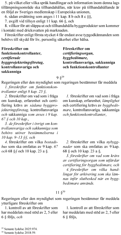 2. föreskrifter om vilka bostadshus som ska omfattas av 9 kap. 68 § och 10 kap. 23 a §, 3. föreskrifter om vad som krävs av certifieringsorgan som utfärdar certifiering för byggbedömare. |