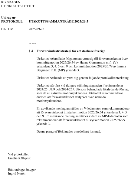 Utrikesutskottets yttrande protokollsutdrag 2025/26:3 § 4