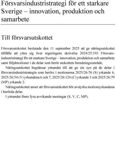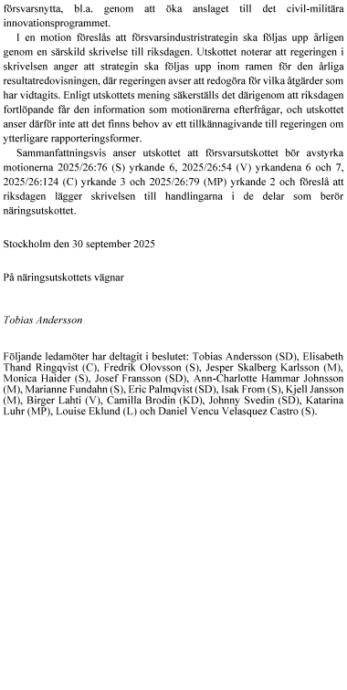 Den 12 juni 2025 överlämnade regeringen skrivelsen Försvarsindustristrategi för ett starkare Sverige – innovation, produktion och samarbete (skr. 2024/25:193) till riksdagen. Fredagen den 13 juni 2025 hänvisade riksdagen skrivelsen till försvarsutskottet. Den 11 september beslutade utskottet att ge näringsutskottet tillfälle att yttra sig över skrivelsen och eventuella följdmotioner i de delar som berör näringsutskottets beredningsområde, och den 18 september fattade utskottet beslut om att ge utrikesutskottet samma möjlighet eftersom flera yrkanden i följdmotioner bl.a. rör export-kontrollfrågor (se bilagorna 2 och 3).