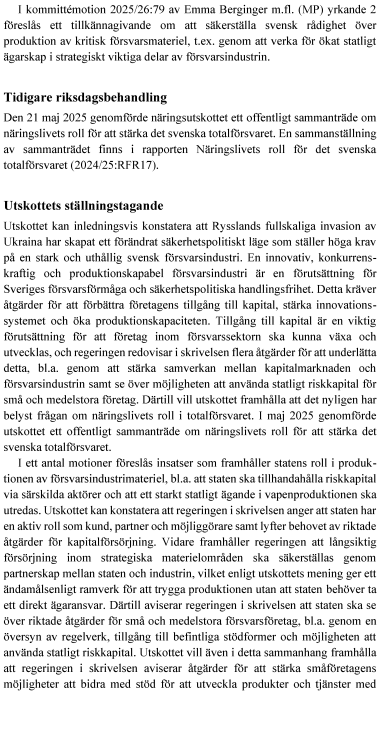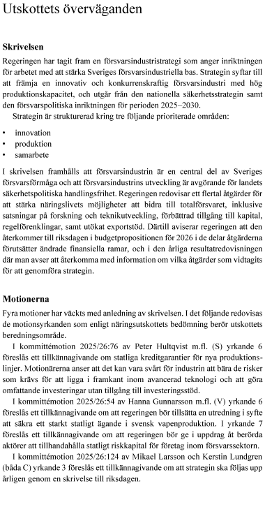 Utskottet föreslår att riksdagen avslår samtliga motionsyrkanden och lägger skrivelse 2024/25:193 till handlingarna, bl.a. med hänvisning till regeringens pågående arbete med att stärka näringslivets förutsättningar att bidra till Sveriges säkerhet. Motionsyrkandena handlar om ägandeformer och finansiering, internationell samverkan, upphandling och import av krigs-materiel, försvarsindustrins utveckling och villkor m.m.