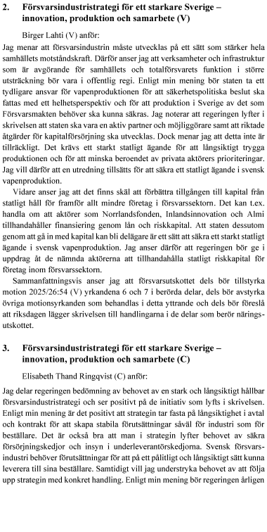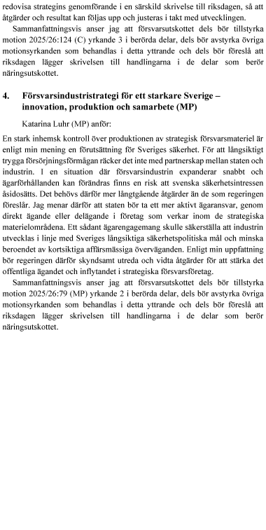 Försvarsindustriell utveckling med hänsyn till Sveriges klimat- och miljömål, punkt 10 (V, MP) |