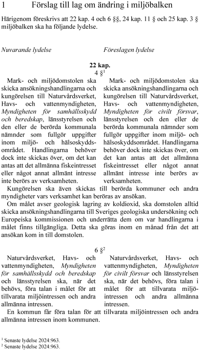 1. Riksdagen antar regeringens förslag till lag om ändring i miljöbalken.
