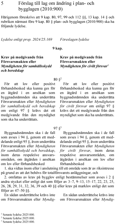 5. Riksdagen antar regeringens förslag till lag om ändring i plan- och bygglagen (2010:900).