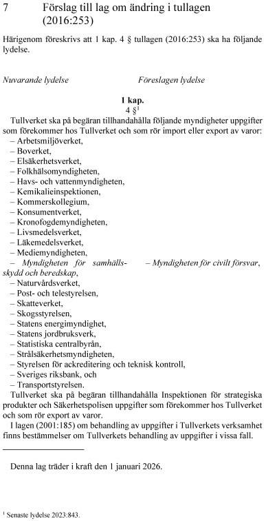 7. Riksdagen antar regeringens förslag till lag om ändring i tullagen (2016:253).