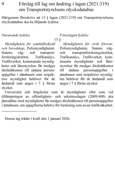 9. Riksdagen antar regeringens förslag till lag om ändring i lagen (2021:319) om Transportstyrelsens olycksdatabas.