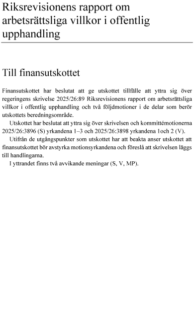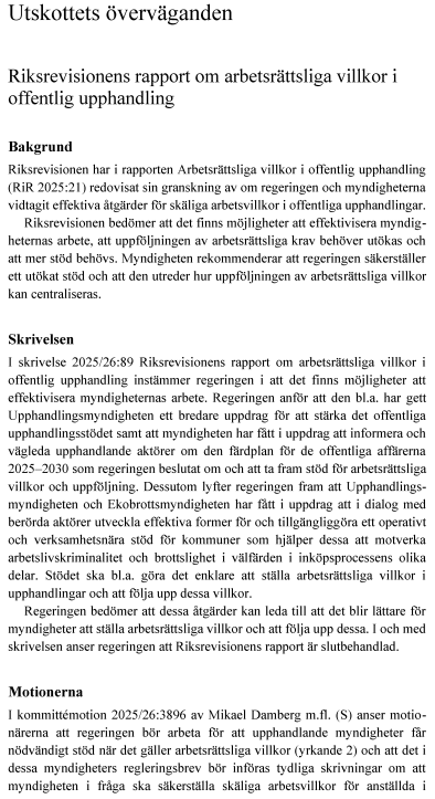 Den 10 september 2025 överlämnade riksdagen (talmannen) Riksrevisionens rapport Arbetsrättsliga villkor i offentlig upphandling (RiR 2025:21) till regeringen, i enlighet med 9 kap. 10 § sista stycket riksdagsordningen. Den 23 december 2025 återkom regeringen till riksdagen med skrivelse 2025/26:89 Riksrevisionens rapport om arbetsrättsliga villkor i offentlig upphandling.